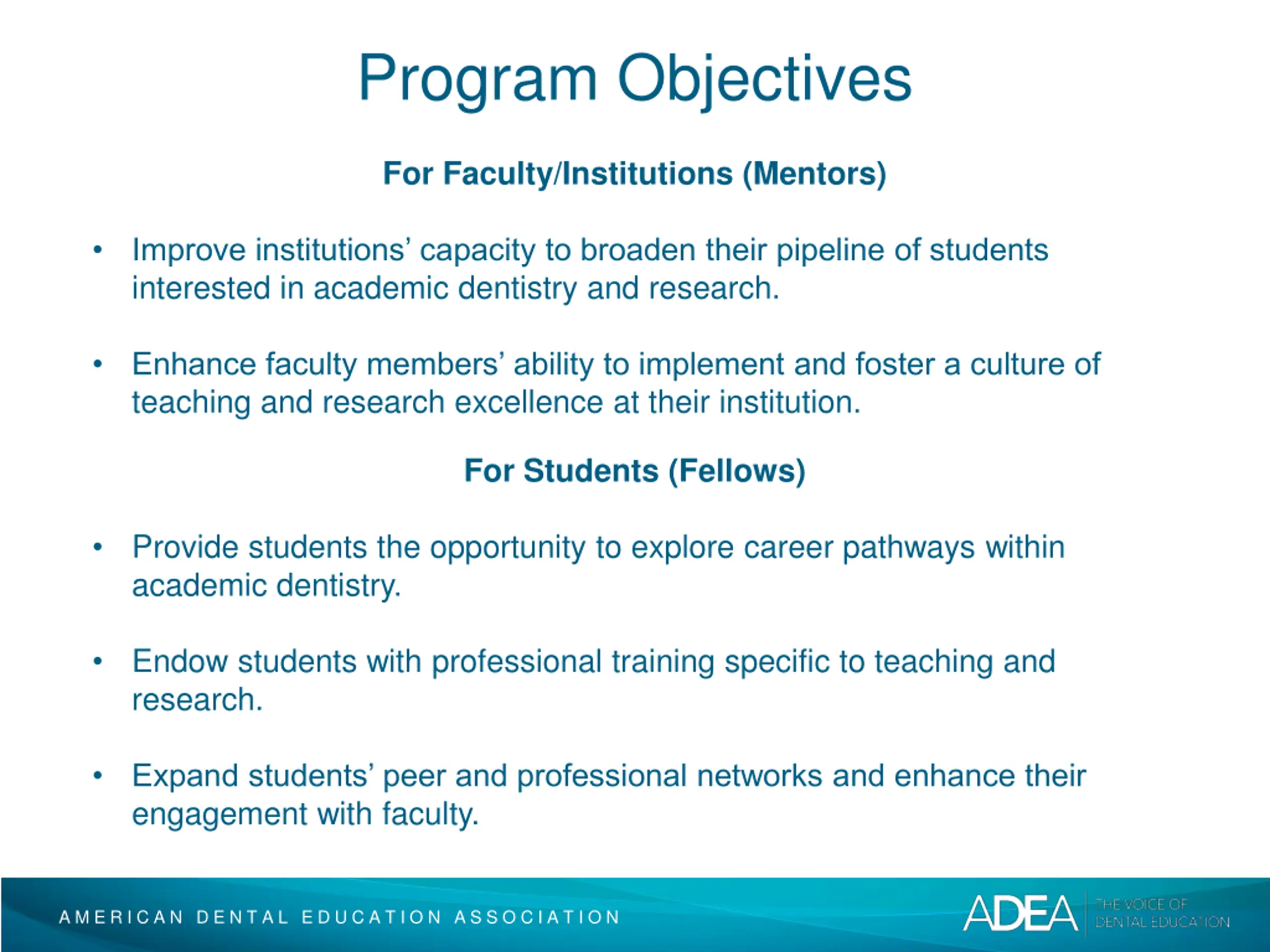 Program Objectives For Faculty/Institutions (Mentors) Improve institutions capacity to broaden their pipeline of students interested in academic dentistry and research. Enhance faculty members ability to implement and foster a culture of teaching and research excellence at their institution. For Students (Fellows) Provide students the opportunity to explore career pathways within academic dentistry. Endow students with professional training specific to teaching and research. Expand students peer and professional networks and enhance their engagement with faculty. A M E R I C A N D E N T A L E D U C A T I O N A S S O C I A T I O N