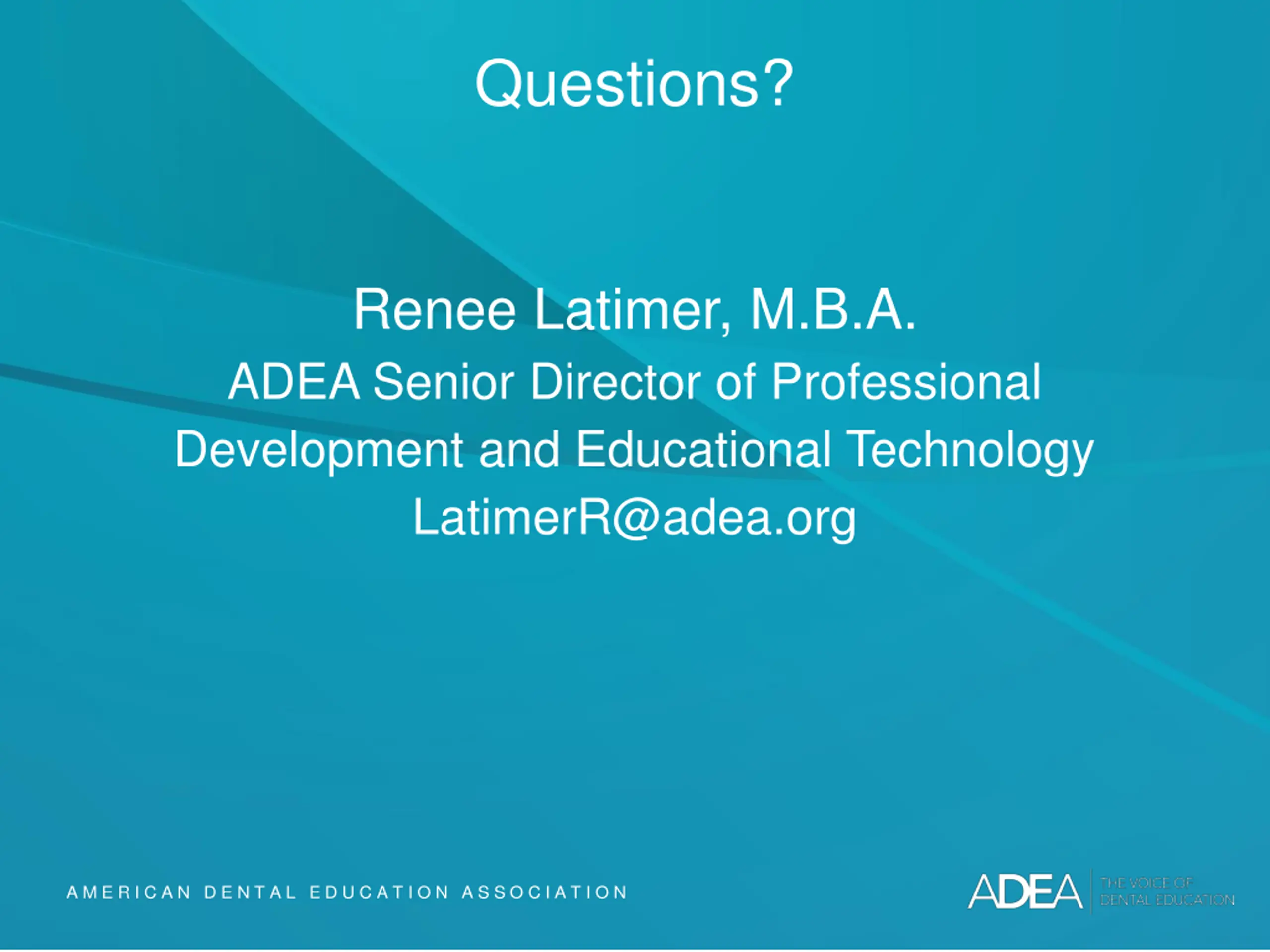 Questions? Renee Latimer, M.B.A. ADEA Senior Director of Professional Development and Educational Technology LatimerR@adea.org A M E R I C A N D E N T A L E D U C A T I O N A S S O C I A T I O N