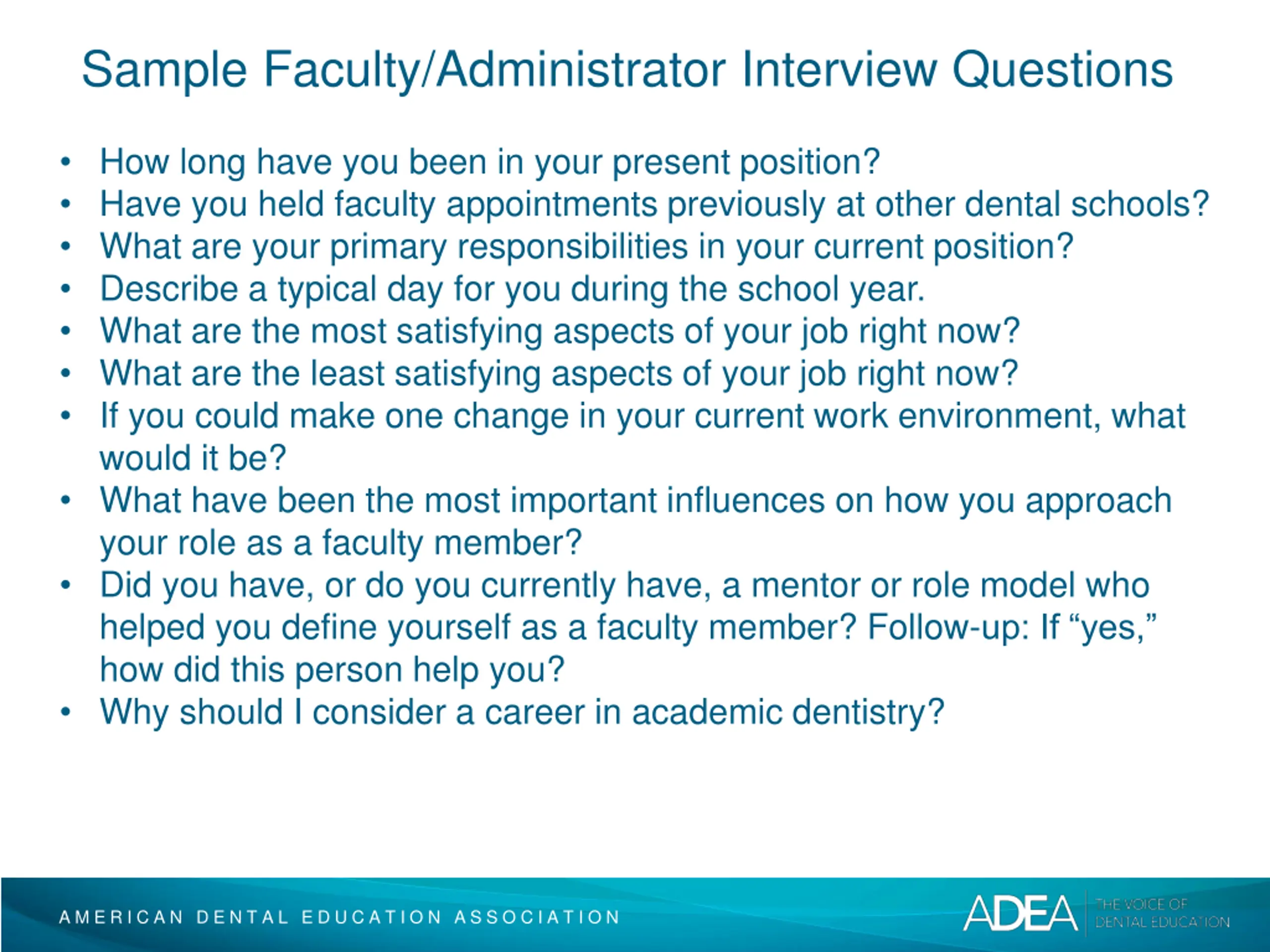 Sample Faculty/Administrator Interview Questions How long have you been in your present position? Have you held faculty appointments previously at other dental schools? What are your primary responsibilities in your current position? Describe a typical day for you during the school year. What are the most satisfying aspects of your job right now? What are the least satisfying aspects of your job right now? If you could make one change in your current work environment, what would it be? What have been the most important influences on how you approach your role as a faculty member? Did you have, or do you currently have, a mentor or role model who helped you define yourself as a faculty member? Follow-up: If yes, how did this person help you? Why should I consider a career in academic dentistry? A M E R I C A N D E N T A L E D U C A T I O N A S S O C I A T I O N