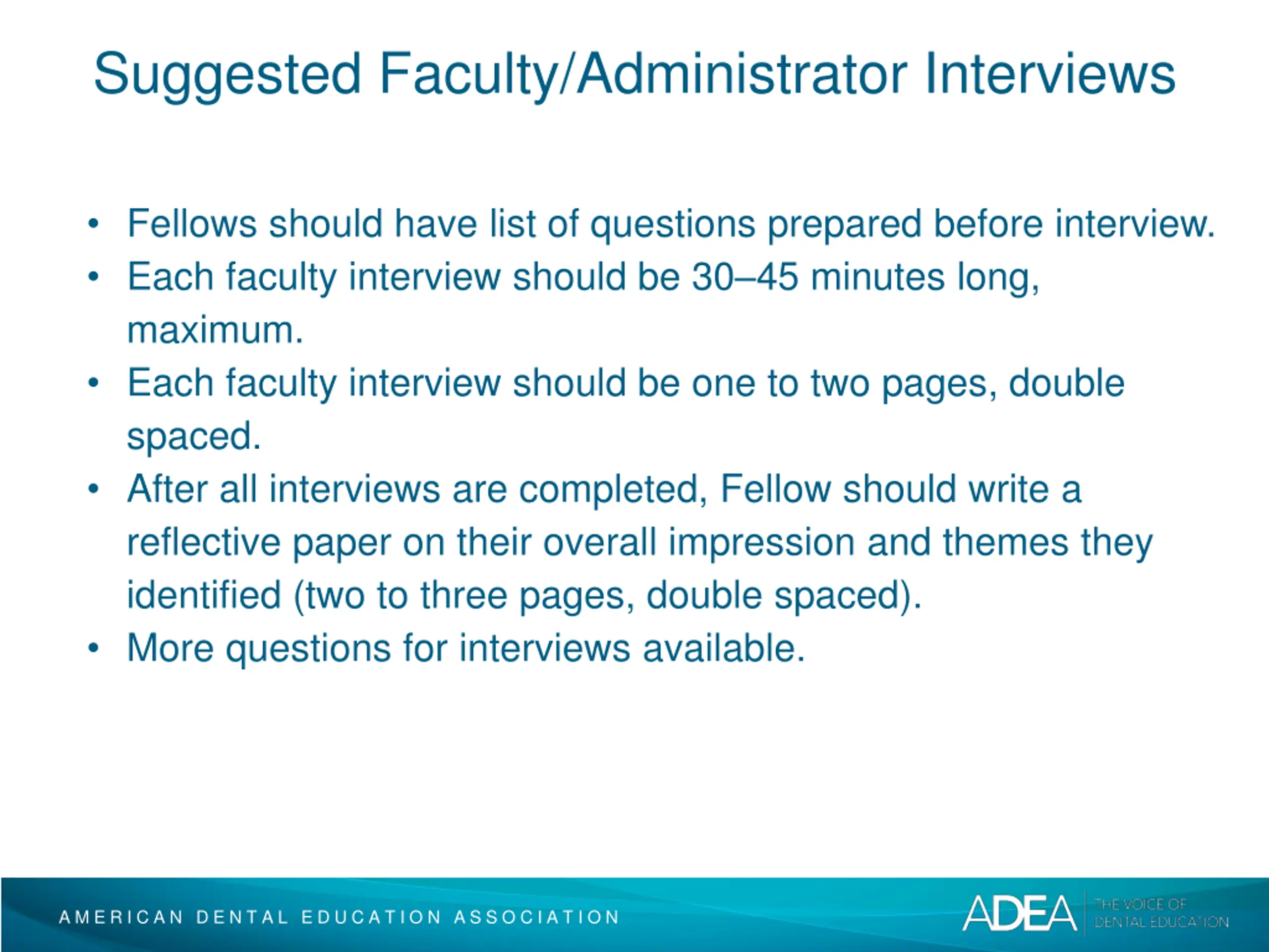 Suggested Faculty/Administrator Interviews Fellows should have list of questions prepared before interview. Each faculty interview should be 30 45 minutes long, maximum. Each faculty interview should be one to two pages, double spaced. After all interviews are completed, Fellow should write a reflective paper on their overall impression and themes they identified (two to three pages, double spaced). More questions for interviews available. A M E R I C A N D E N T A L E D U C A T I O N A S S O C I A T I O N