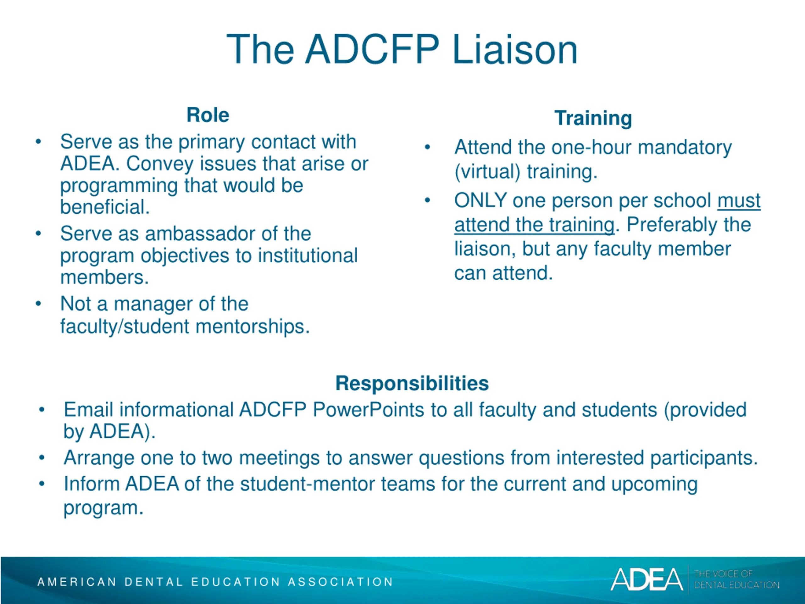 The ADCFP Liaison Role Training Serve as the primary contact with ADEA. Convey issues that arise or programming that would be beneficial. Serve as ambassador of the program objectives to institutional members. Not a manager of the faculty/student mentorships. Attend the one-hour mandatory (virtual) training. ONLY one person per school must attend the training. Preferably the liaison, but any faculty member can attend. Responsibilities Email informational ADCFP PowerPoints to all faculty and students (provided by ADEA). Arrange one to two meetings to answer questions from interested participants. Inform ADEA of the student-mentor teams for the current and upcoming program. A M E R I C A N D E N T A L E D U C A T I O N A S S O C I A T I O N