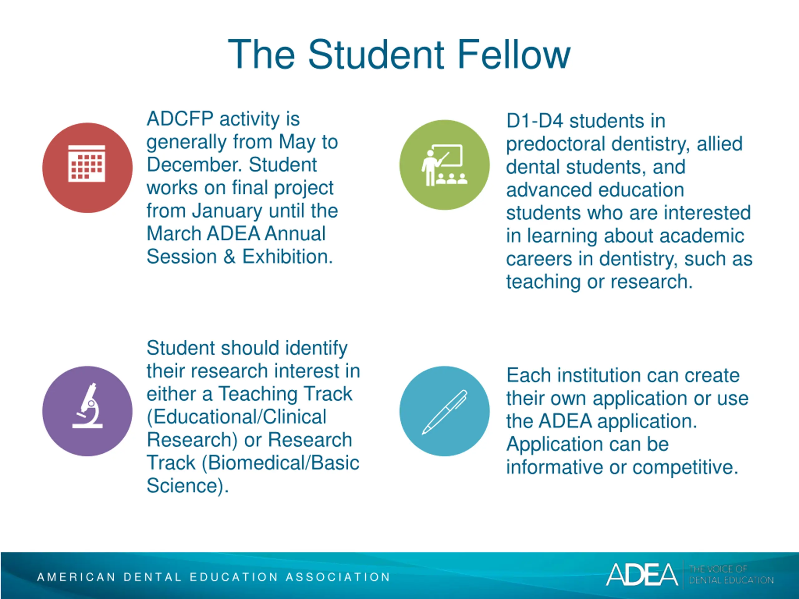 The Student Fellow ADCFP activity is generally from May to December. Student works on final project from January until the March ADEA Annual Session & Exhibition. D1-D4 students in predoctoral dentistry, allied dental students, and advanced education students who are interested in learning about academic careers in dentistry, such as teaching or research. Student should identify their research interest in either a Teaching Track (Educational/Clinical Research) or Research Track (Biomedical/Basic Science). Each institution can create their own application or use the ADEA application. Application can be informative or competitive. A M E R I C A N D E N T A L E D U C A T I O N A S S O C I A T I O N