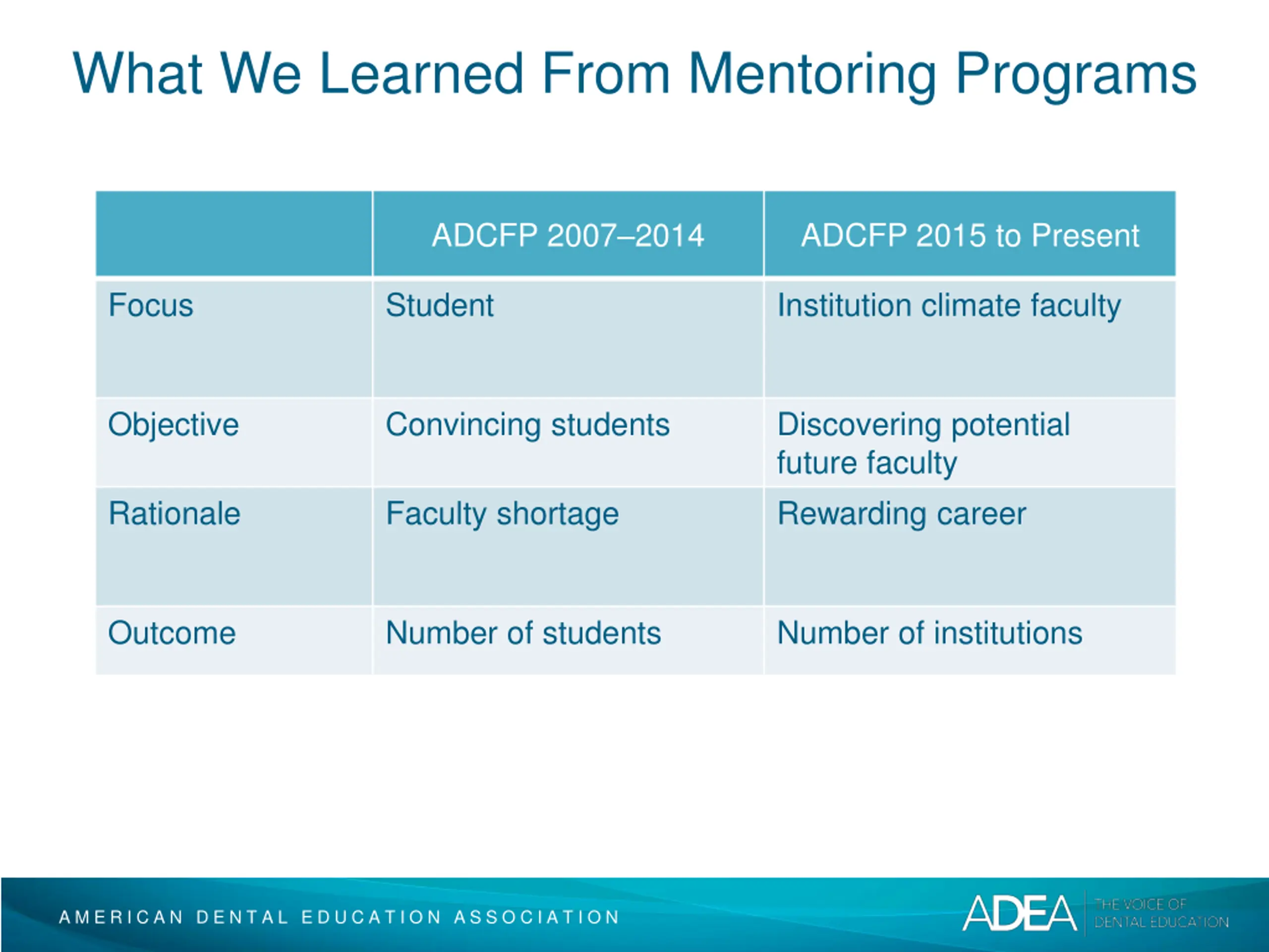 What We Learned From Mentoring Programs ADCFP 2007 2014 ADCFP 2015 to Present Focus Student Institution climate faculty Objective Convincing students Discovering potential future faculty Rewarding career Rationale Faculty shortage Outcome Number of students Number of institutions A M E R I C A N D E N T A L E D U C A T I O N A S S O C I A T I O N