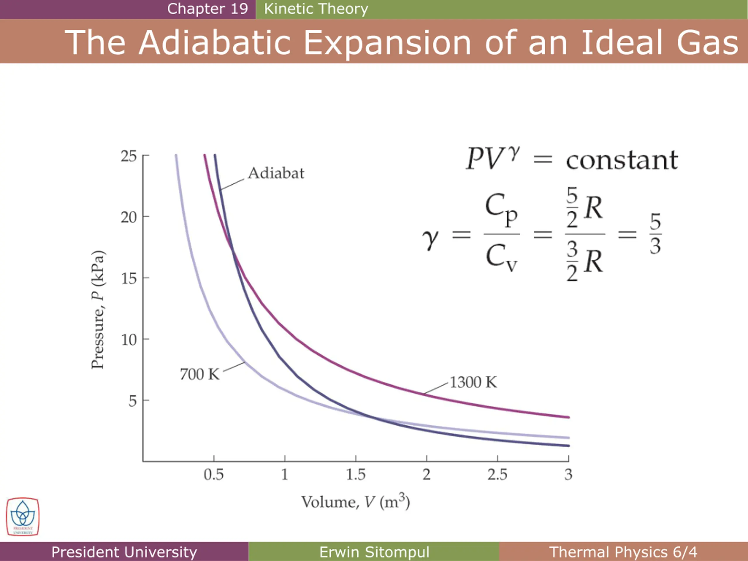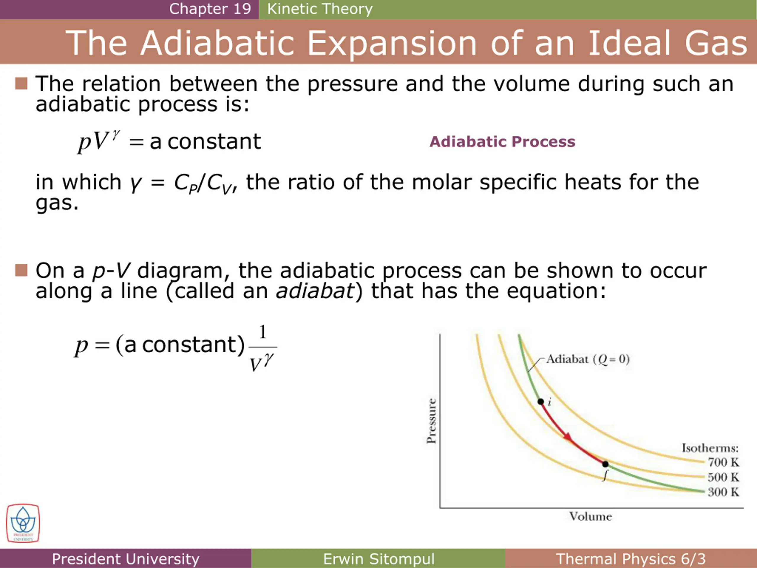 Chapter 19 Kinetic Theory The Adiabatic Expansion of an Ideal Gas The relation between the pressure and the volume during such an adiabatic process is: pV = a constant Adiabatic Process in which = CP/CV, the ratio of the molar specific heats for the gas. On a p-V diagram, the adiabatic process can be shown to occur along a line (called an adiabat) that has the equation: 1 = a constant) ( p V President University Erwin Sitompul Thermal Physics 6/3