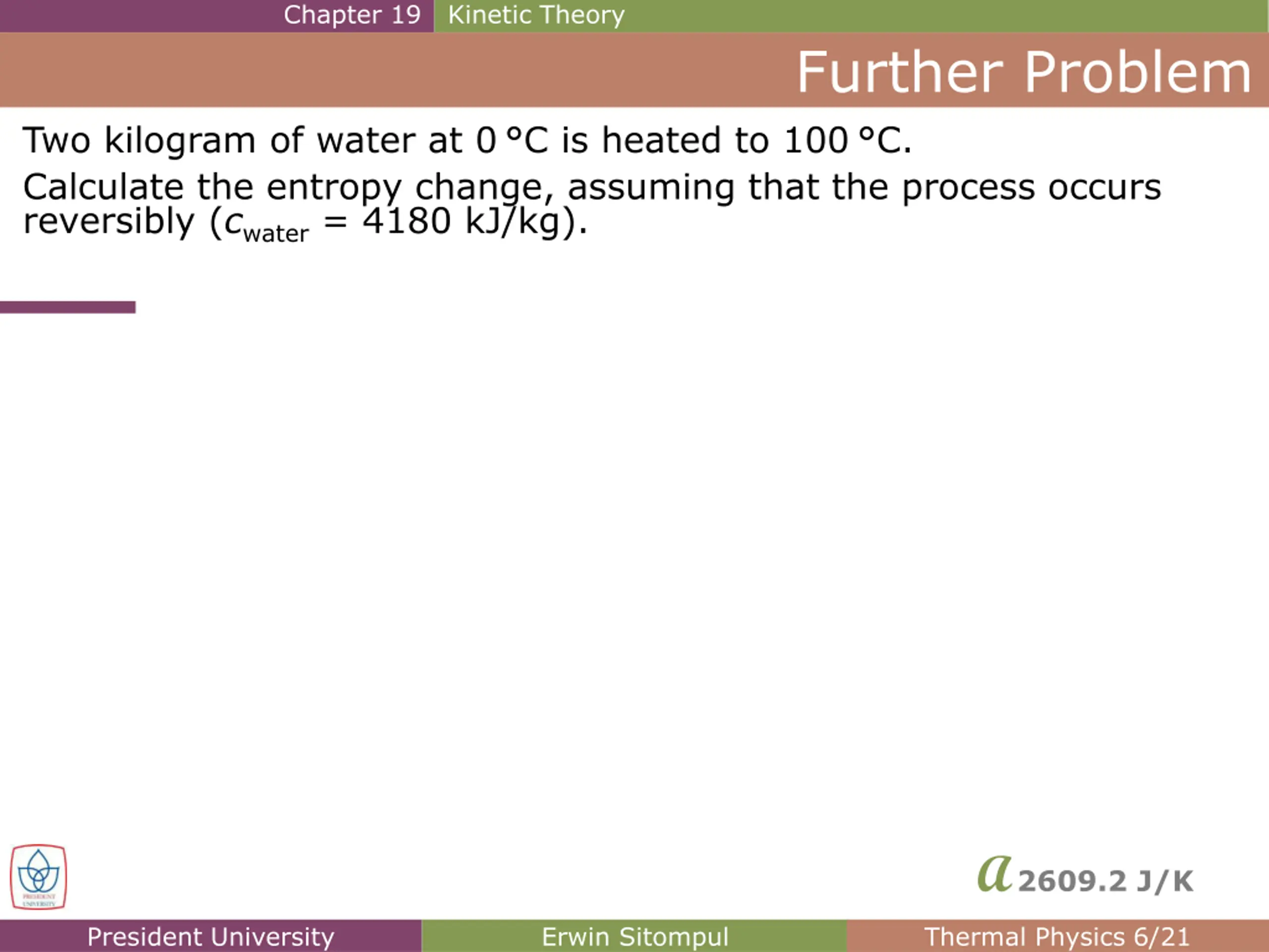 Chapter 19 Kinetic Theory Further Problem Two kilogram of water at 0 C is heated to 100 C. Calculate the entropy change, assuming that the process occurs reversibly (cwater= 4180 kJ/kg). A2609.2 J/K President University Erwin Sitompul Thermal Physics 6/21
