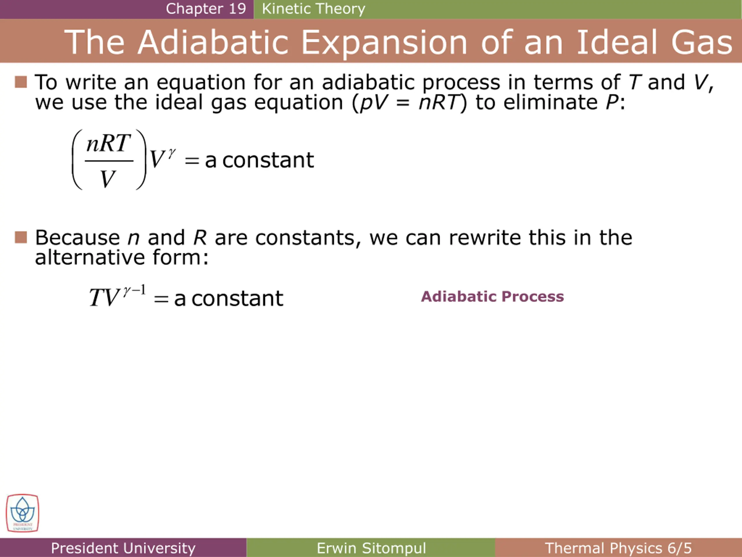 Chapter 19 Kinetic Theory The Adiabatic Expansion of an Ideal Gas To write an equation for an adiabatic process in terms of T and V, we use the ideal gas equation (pV = nRT) to eliminate P: nRT V = V a constant Because n and R are constants, we can rewrite this in the alternative form: TV = a constant 1 Adiabatic Process President University Erwin Sitompul Thermal Physics 6/5