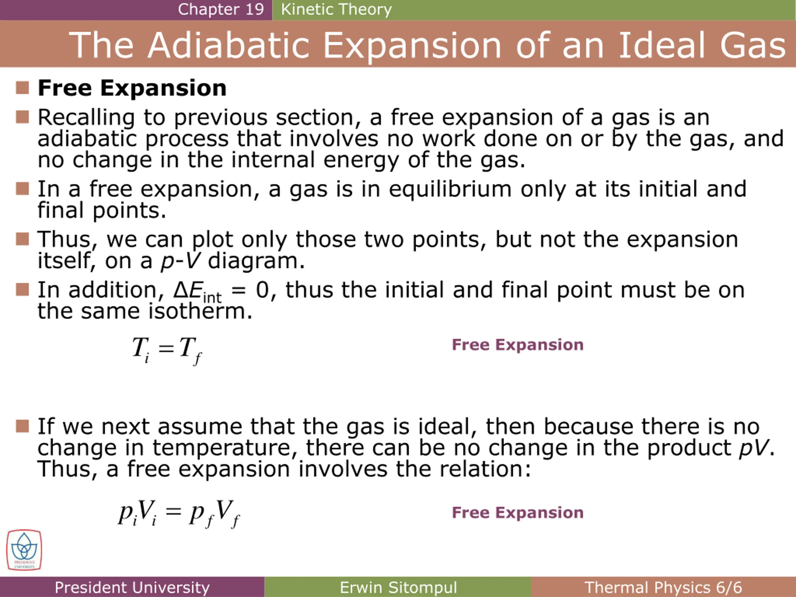 Chapter 19 Kinetic Theory The Adiabatic Expansion of an Ideal Gas Free Expansion Recalling to previous section, a free expansion of a gas is an adiabatic process that involves no work done on or by the gas, and no change in the internal energy of the gas. In a free expansion, a gas is in equilibrium only at its initial and final points. Thus, we can plot only those two points, but not the expansion itself, on a p-V diagram. In addition, Eint = 0, thus the initial and final point must be on the same isotherm. T T = Free Expansion i f If we next assume that the gas is ideal, then because there is no change in temperature, there can be no change in the product pV. Thus, a free expansion involves the relation: = pV p V Free Expansion i i f f President University Erwin Sitompul Thermal Physics 6/6