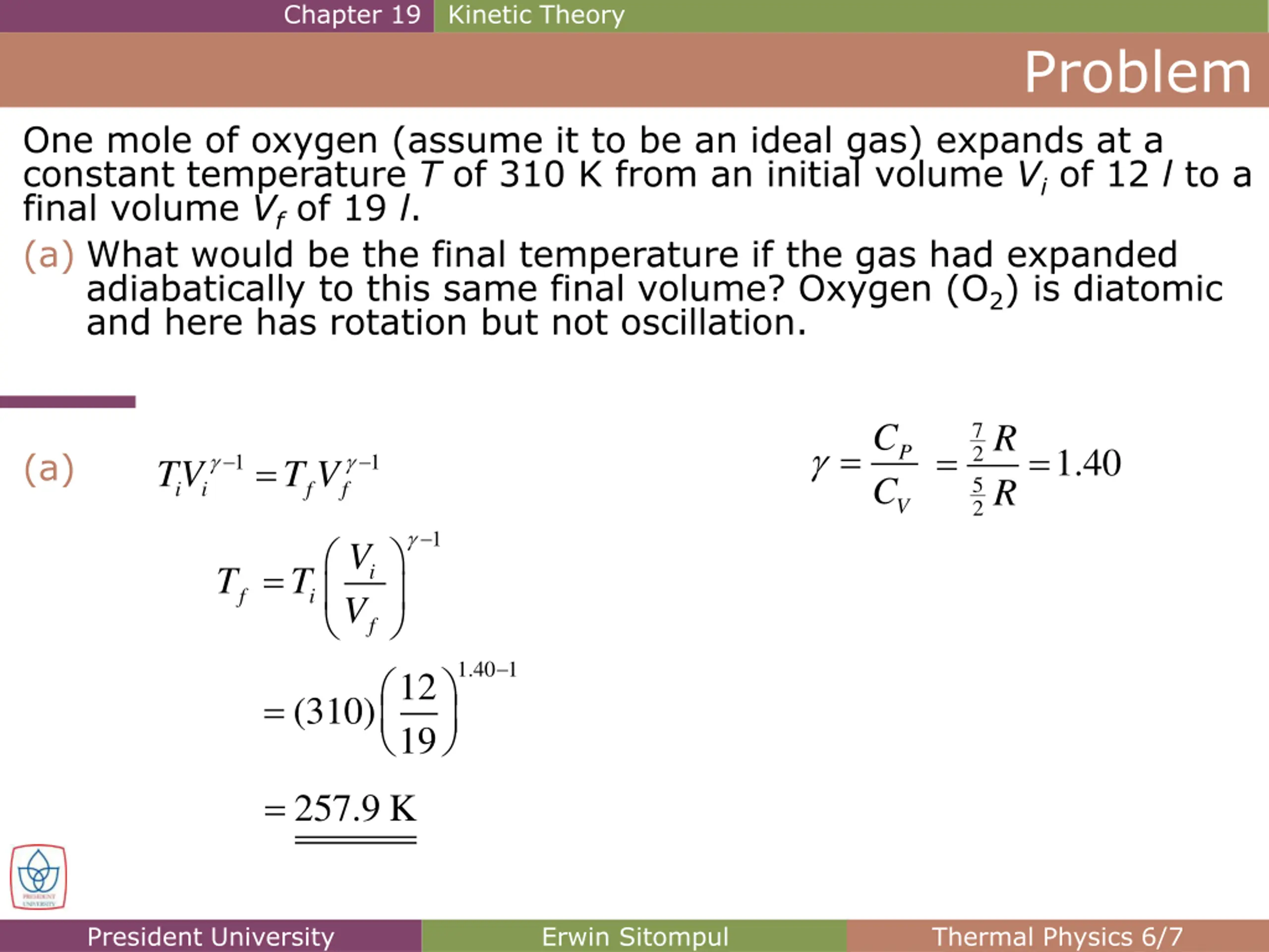 Chapter 19 Kinetic Theory Problem One mole of oxygen (assume it to be an ideal gas) expands at a constant temperature T of 310 K from an initial volume Vi of 12 l to a final volume Vf of 19 l. (a) What would be the final temperature if the gas had expanded adiabatically to this same final volume? Oxygen (O2) is diatomic and here has rotation but not oscillation. C C R R 7 2 5 2 = = = P 1.40 (a) = 1 1 TV T V i i f f V 12 19 1 V V = i T T f i f 1.40 1 = (310) = 257.9 K President University Erwin Sitompul Thermal Physics 6/7