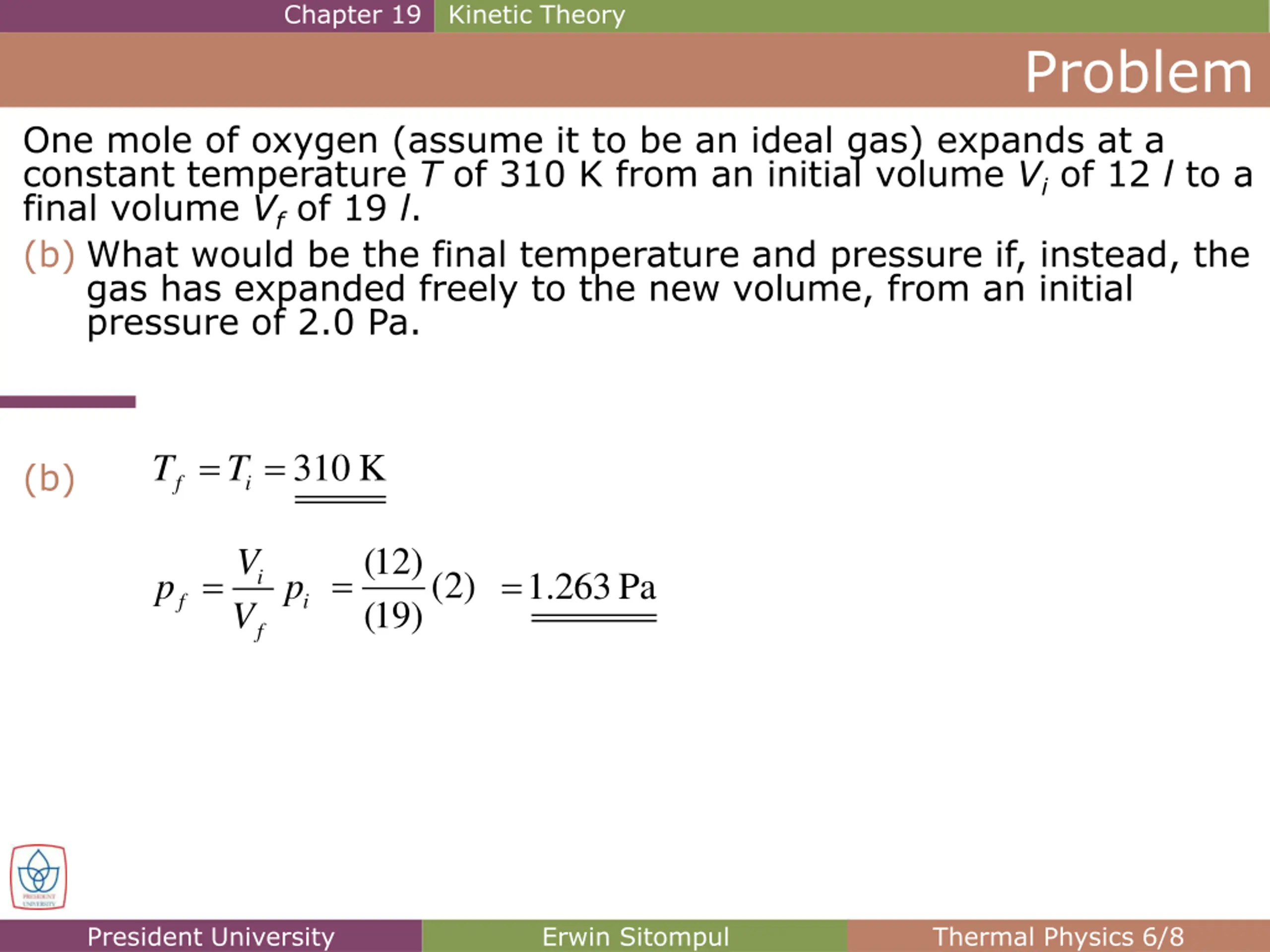 Chapter 19 Kinetic Theory Problem One mole of oxygen (assume it to be an ideal gas) expands at a constant temperature T of 310 K from an initial volume Vi of 12 l to a final volume Vf of 19 l. (b) What would be the final temperature and pressure if, instead, the gas has expanded freely to the new volume, from an initial pressure of 2.0 Pa. = = 310 K T T (b) f i (12)(2) (19) V V = = = 1.263Pa p i p f i f President University Erwin Sitompul Thermal Physics 6/8