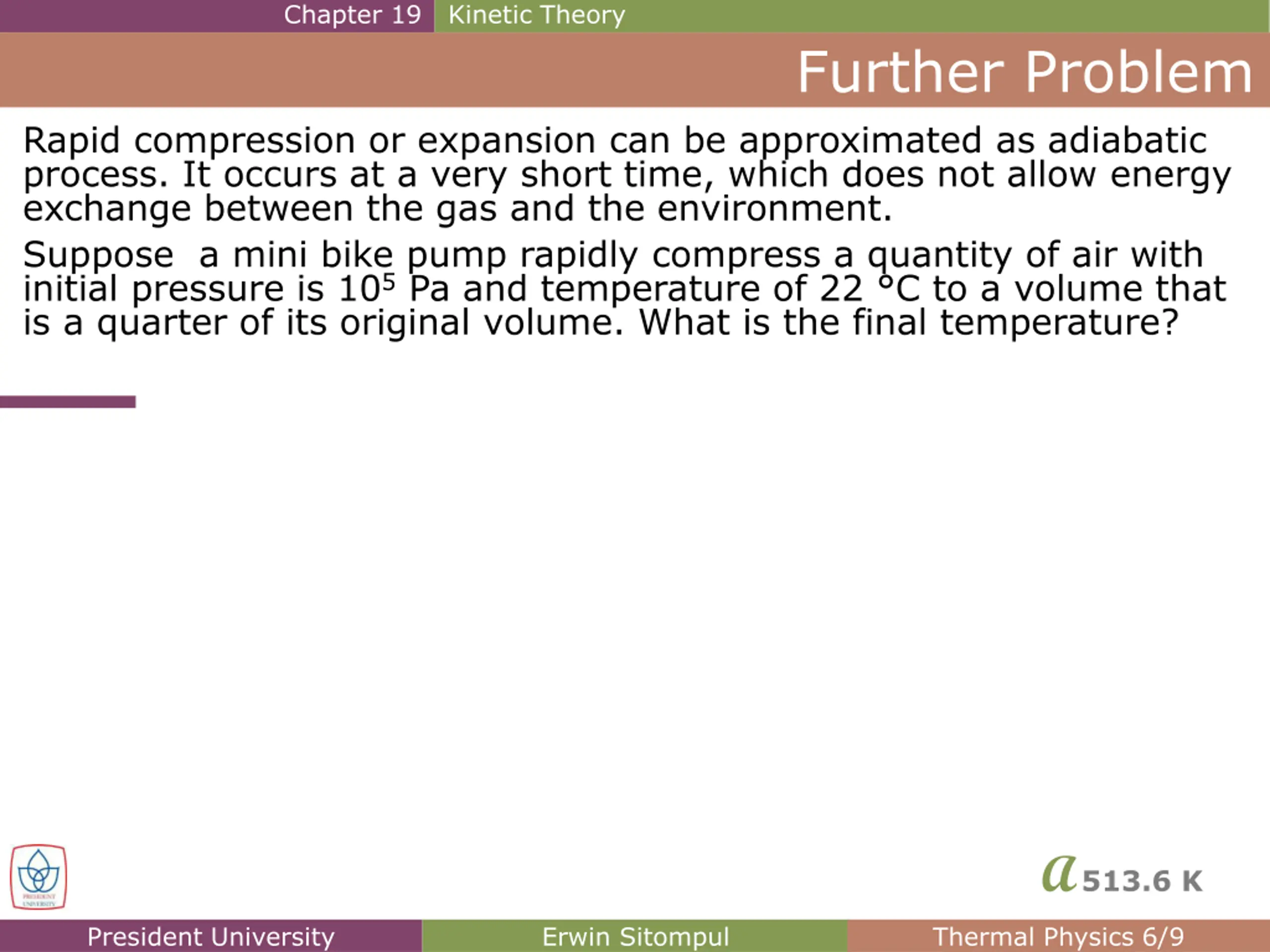 Chapter 19 Kinetic Theory Further Problem Rapid compression or expansion can be approximated as adiabatic process. It occurs at a very short time, which does not allow energy exchange between the gas and the environment. Suppose a mini bike pump rapidly compress a quantity of air with initial pressure is 105Pa and temperature of 22 C to a volume that is a quarter of its original volume. What is the final temperature? A513.6 K President University Erwin Sitompul Thermal Physics 6/9
