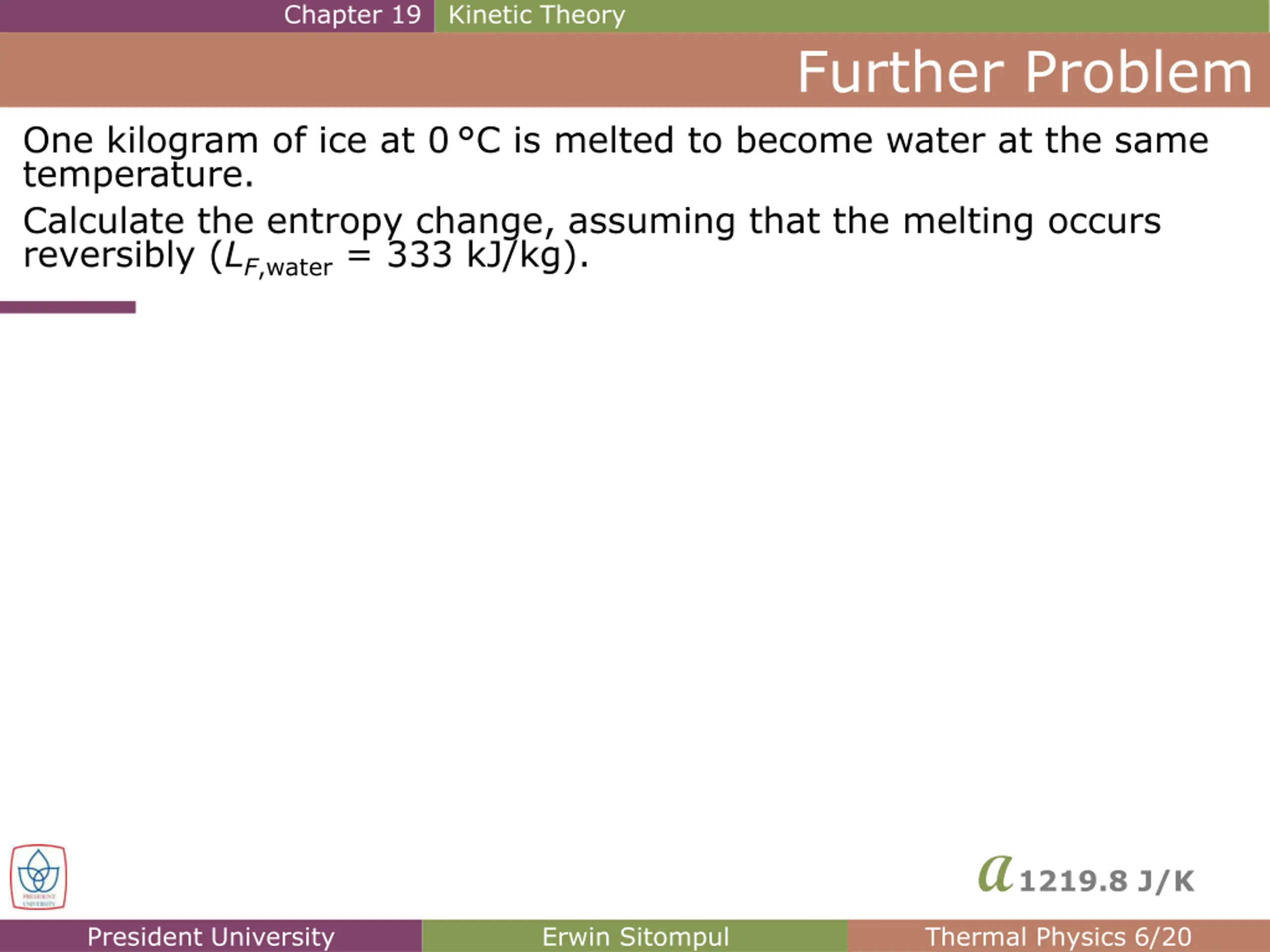 Chapter 19 Kinetic Theory Further Problem One kilogram of ice at 0 C is melted to become water at the same temperature. Calculate the entropy change, assuming that the melting occurs reversibly (LF,water= 333 kJ/kg). A1219.8 J/K President University Erwin Sitompul Thermal Physics 6/20