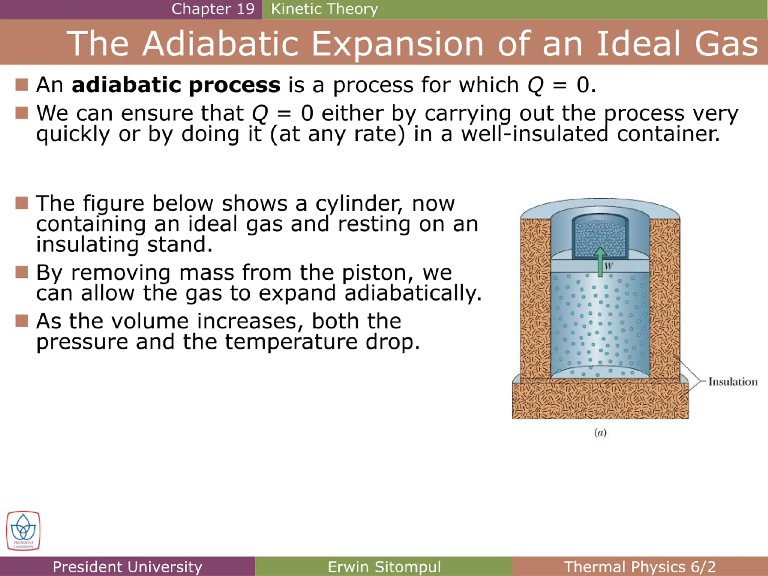 Chapter 19 Kinetic Theory The Adiabatic Expansion of an Ideal Gas An adiabatic process is a process for which Q = 0. We can ensure that Q = 0 either by carrying out the process very quickly or by doing it (at any rate) in a well-insulated container. The figure below shows a cylinder, now containing an ideal gas and resting on an insulating stand. By removing mass from the piston, we can allow the gas to expand adiabatically. As the volume increases, both the pressure and the temperature drop. President University Erwin Sitompul Thermal Physics 6/2