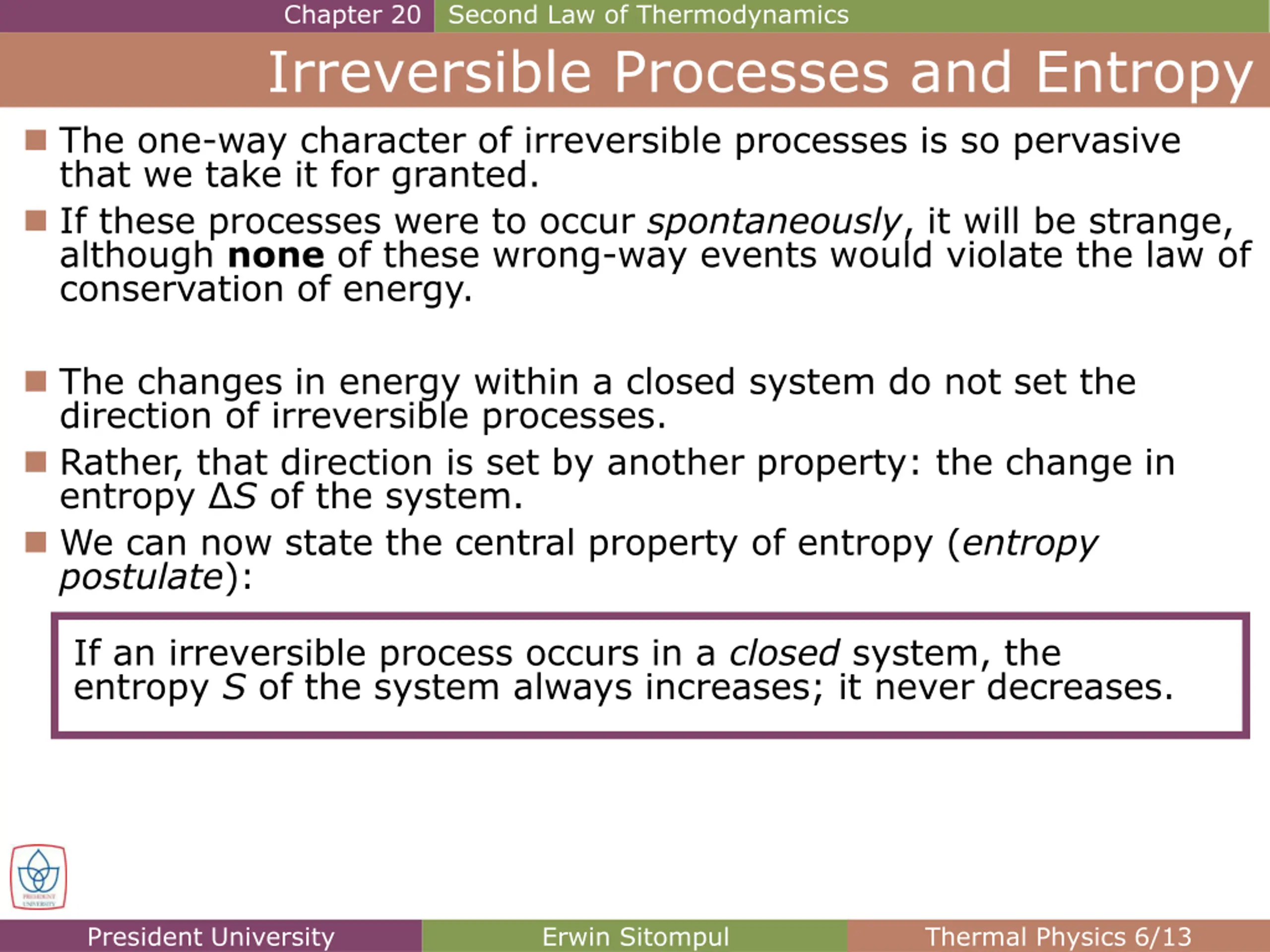 Chapter 20 Second Law of Thermodynamics Irreversible Processes and Entropy The one-way character of irreversible processes is so pervasive that we take it for granted. If these processes were to occur spontaneously, it will be strange, although none of these wrong-way events would violate the law of conservation of energy. The changes in energy within a closed system do not set the direction of irreversible processes. Rather, that direction is set by another property: the change in entropy S of the system. We can now state the central property of entropy (entropy postulate): If an irreversible process occurs in a closed system, the entropy S of the system always increases; it never decreases. President University Erwin Sitompul Thermal Physics 6/13