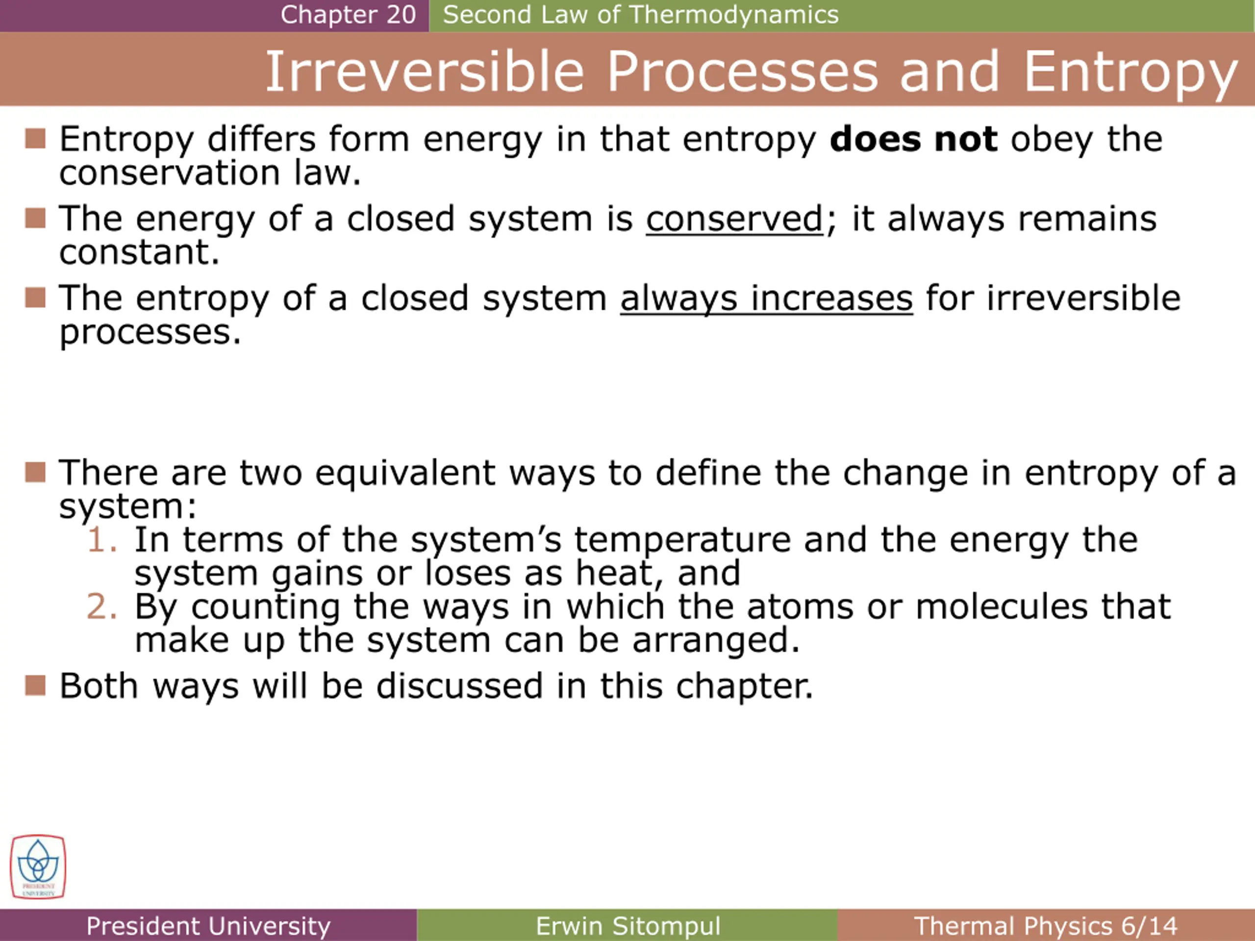 Chapter 20 Second Law of Thermodynamics Irreversible Processes and Entropy Entropy differs form energy in that entropy does not obey the conservation law. The energy of a closed system is conserved; it always remains constant. The entropy of a closed system always increases for irreversible processes. There are two equivalent ways to define the change in entropy of a system: 1. In terms of the system s temperature and the energy the system gains or loses as heat, and 2. By counting the ways in which the atoms or molecules that make up the system can be arranged. Both ways will be discussed in this chapter. President University Erwin Sitompul Thermal Physics 6/14