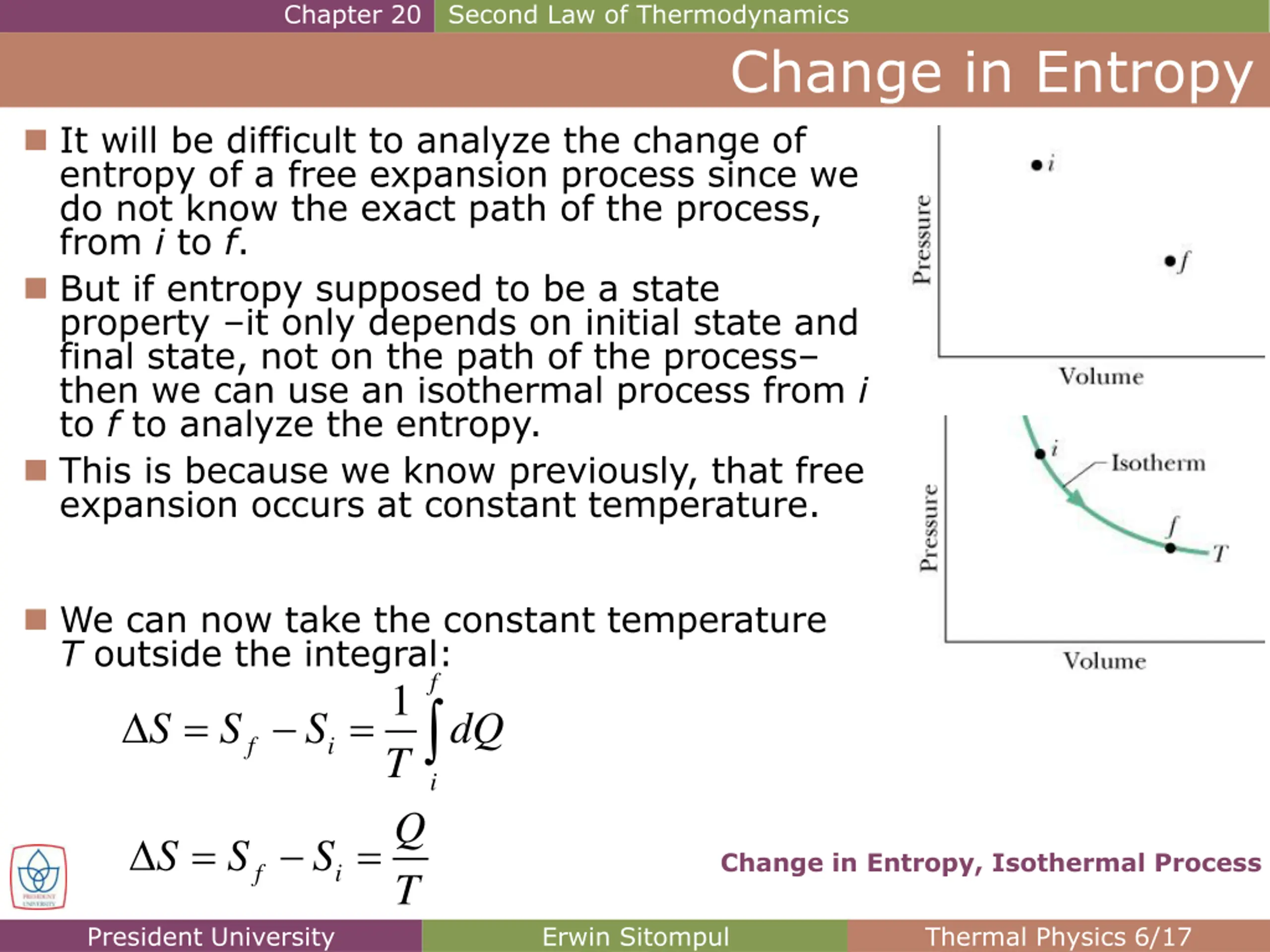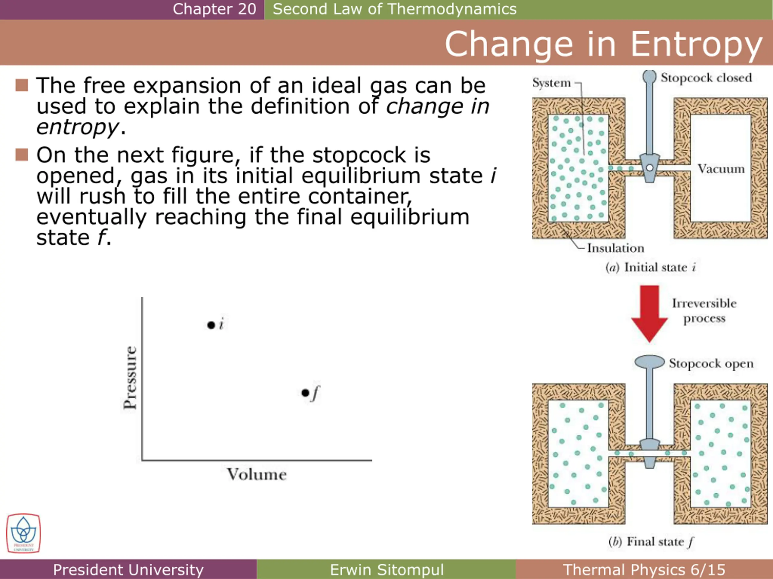 Chapter 20 Second Law of Thermodynamics Change in Entropy The free expansion of an ideal gas can be used to explain the definition of change in entropy. On the next figure, if the stopcock is opened, gas in its initial equilibrium state i will rush to fill the entire container, eventually reaching the final equilibrium state f. President University Erwin Sitompul Thermal Physics 6/15