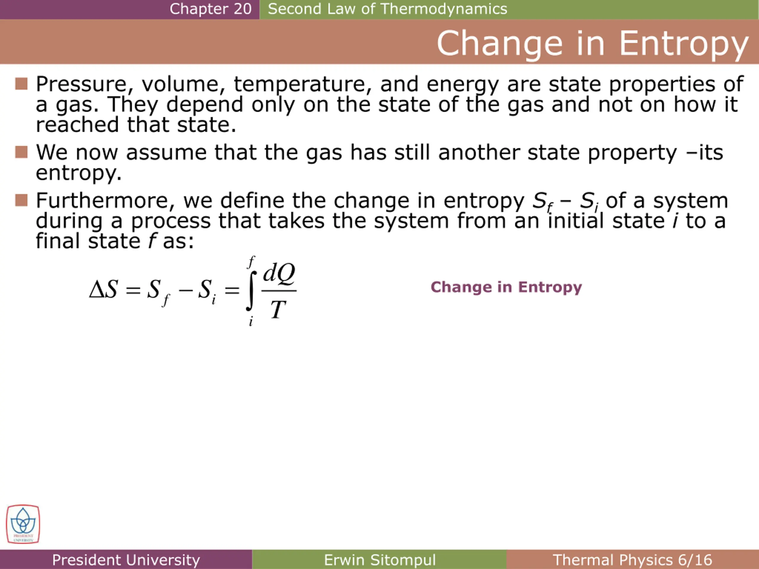 Chapter 20 Second Law of Thermodynamics Change in Entropy Pressure, volume, temperature, and energy are state properties of a gas. They depend only on the state of the gas and not on how it reached that state. We now assume that the gas has still another state property its entropy. Furthermore, we define the change in entropy Sf Si of a system during a process that takes the system from an initial state i to a final state f as: f dQ S S S T = = Change in Entropy f i i President University Erwin Sitompul Thermal Physics 6/16