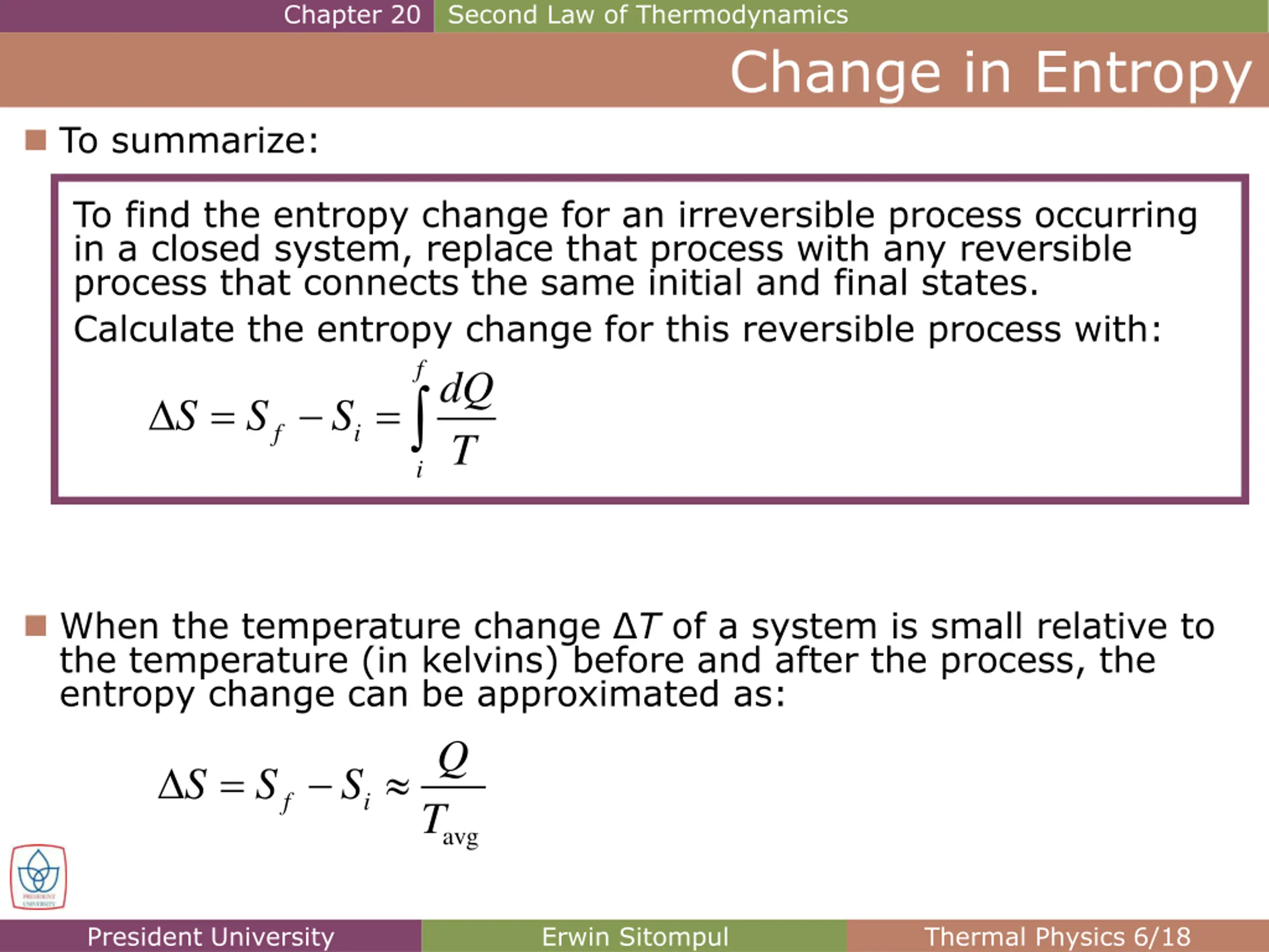 Chapter 20 Second Law of Thermodynamics Change in Entropy To summarize: To find the entropy change for an irreversible process occurring in a closed system, replace that process with any reversible process that connects the same initial and final states. Calculate the entropy change for this reversible process with: f dQ S S S T = = f i i When the temperature change T of a system is small relative to the temperature (in kelvins) before and after the process, the entropy change can be approximated as: Q S S S T = f i avg President University Erwin Sitompul Thermal Physics 6/18
