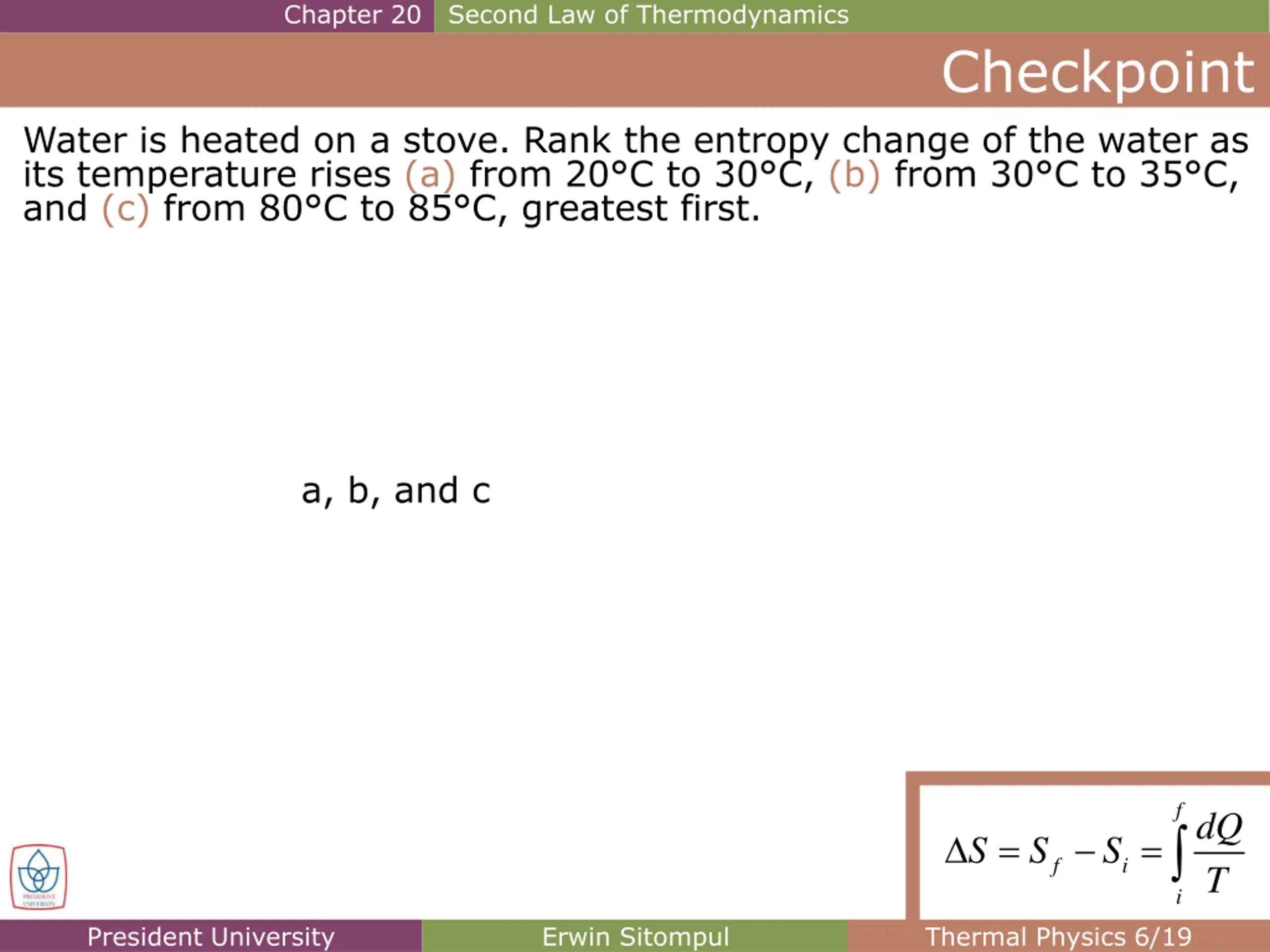 Chapter 20 Second Law of Thermodynamics Checkpoint Water is heated on a stove. Rank the entropy change of the water as its temperature rises (a) from 20 C to 30 C, (b) from 30 C to 35 C, and (c) from 80 C to 85 C, greatest first. a, b, and c f dQ T = = S S S f i i President University Erwin Sitompul Thermal Physics 6/19