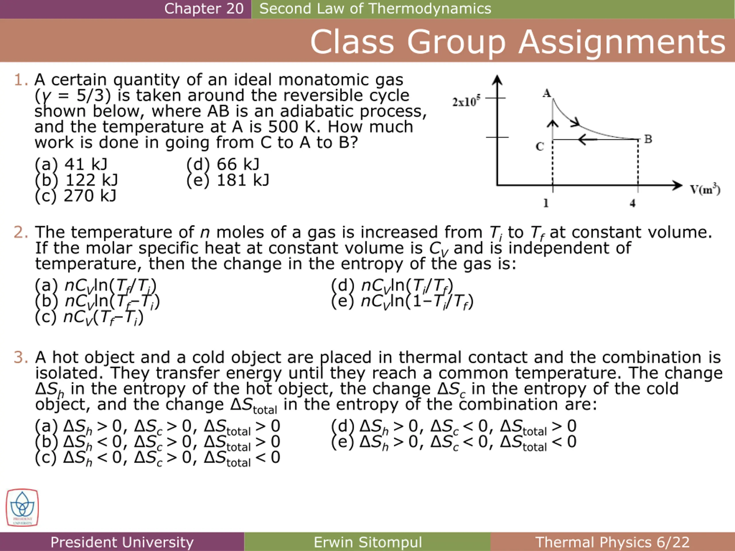 Chapter 20 Second Law of Thermodynamics Class Group Assignments 1. A certain quantity of an ideal monatomic gas ( = 5/3) is taken around the reversible cycle shown below, where AB is an adiabatic process, and the temperature at A is 500 K. How much work is done in going from C to A to B? (a) 41 kJ (d) 66 kJ (b) 122 kJ (e) 181 kJ (c) 270 kJ 2. The temperature of n moles of a gas is increased from Ti to Tf at constant volume. If the molar specific heat at constant volume is CV and is independent of temperature, then the change in the entropy of the gas is: (a) nCVln(Tf/Ti) (d) nCVln(Ti/Tf) (b) nCVln(Tf Ti) (e) nCVln(1 Ti/Tf) (c) nCV(Tf Ti) 3. A hot object and a cold object are placed in thermal contact and the combination is isolated. They transfer energy until they reach a common temperature. The change Sh in the entropy of the hot object, the change Sc in the entropy of the cold object, and the change Stotal in the entropy of the combination are: (a) Sh>0, Sc>0, Stotal>0 (d) Sh>0, Sc<0, Stotal>0 (b) Sh<0, Sc>0, Stotal>0 (e) Sh>0, Sc<0, Stotal<0 (c) Sh<0, Sc>0, Stotal<0 President University Erwin Sitompul Thermal Physics 6/22
