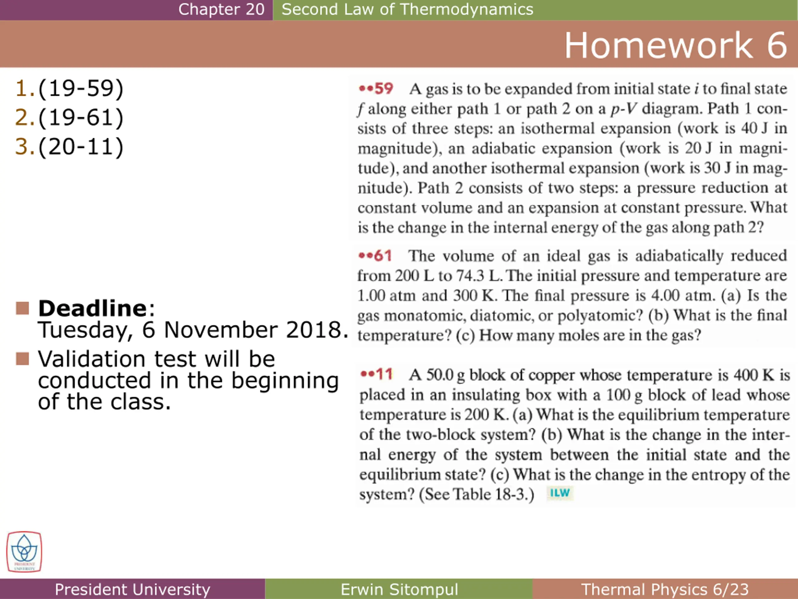 Chapter 20 Second Law of Thermodynamics Homework 6 1.(19-59) 2.(19-61) 3.(20-11) Deadline: Tuesday, 6 November 2018. Validation test will be conducted in the beginning of the class. President University Erwin Sitompul Thermal Physics 6/23