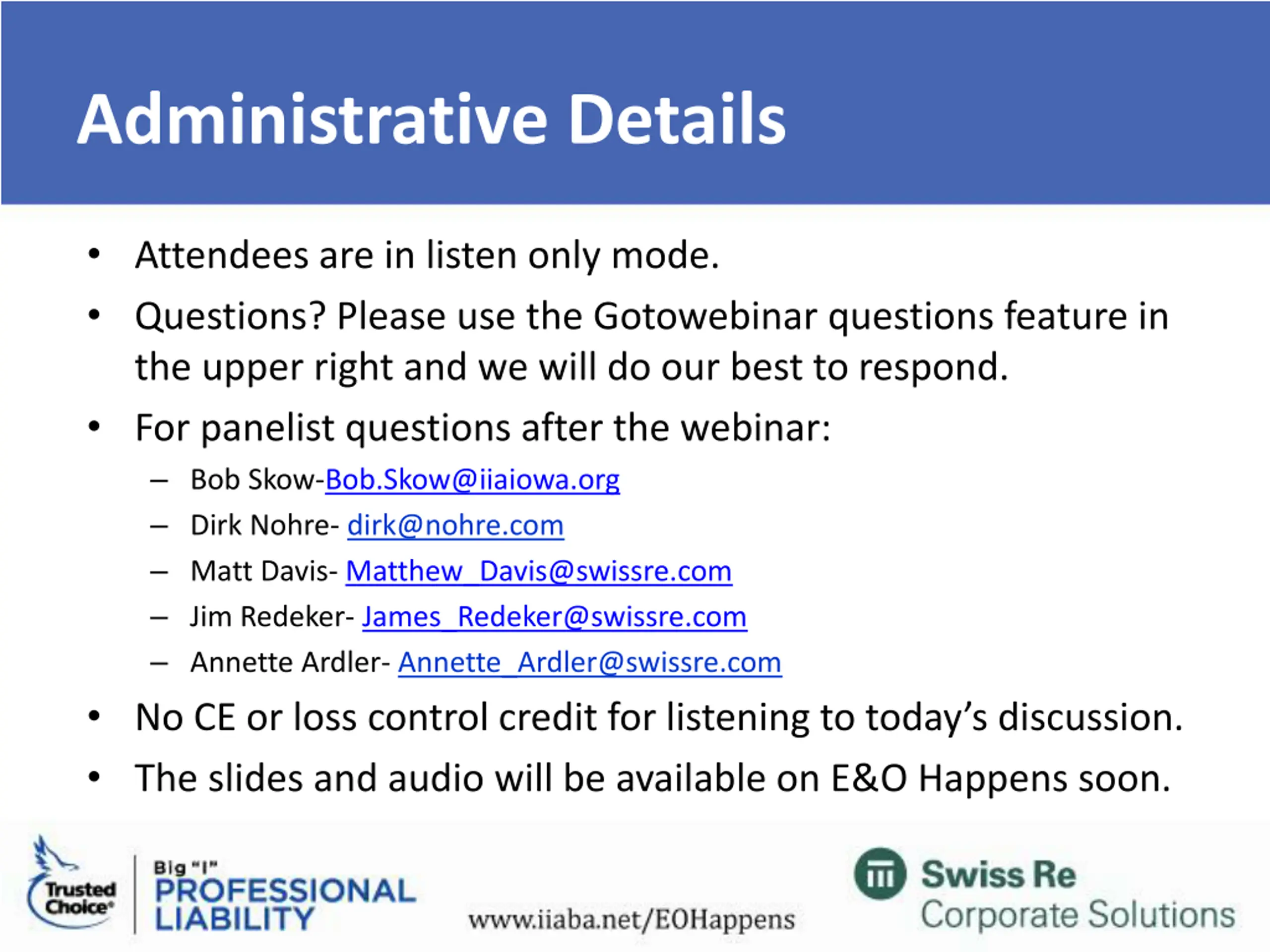 Administrative Details Attendees are in listen only mode. Questions? Please use the Gotowebinar questions feature in the upper right and we will do our best to respond. For panelist questions after the webinar: Bob Skow-Bob.Skow@iiaiowa.org Dirk Nohre- dirk@nohre.com Matt Davis- Matthew_Davis@swissre.com Jim Redeker- James_Redeker@swissre.com Annette Ardler- Annette_Ardler@swissre.com No CE or loss control credit for listening to today s discussion. The slides and audio will be available on E&O Happens soon.