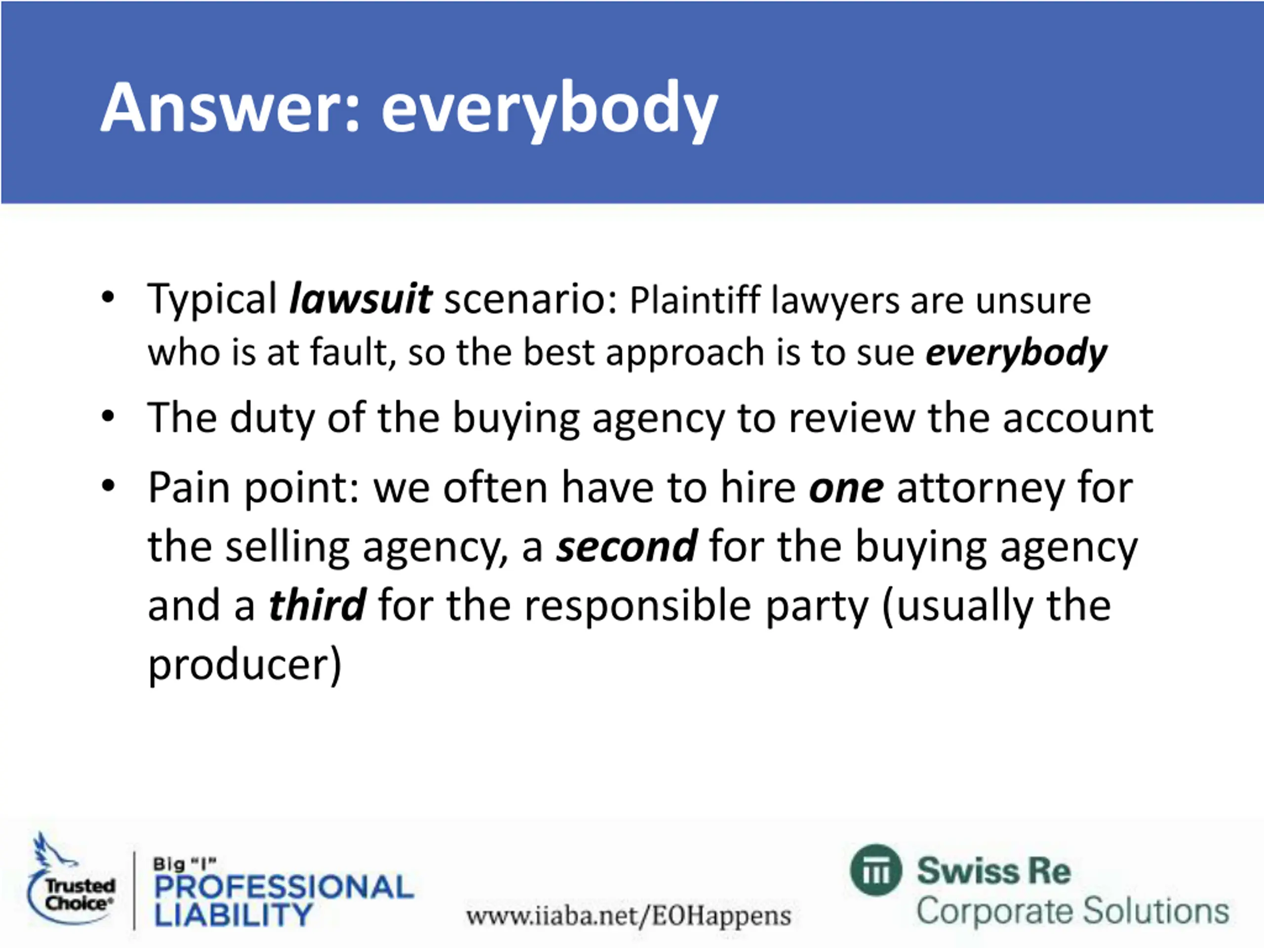 Answer: everybody Typical lawsuit scenario: Plaintiff lawyers are unsure who is at fault, so the best approach is to sue everybody The duty of the buying agency to review the account Pain point: we often have to hire one attorney for the selling agency, a second for the buying agency and a third for the responsible party (usually the producer)