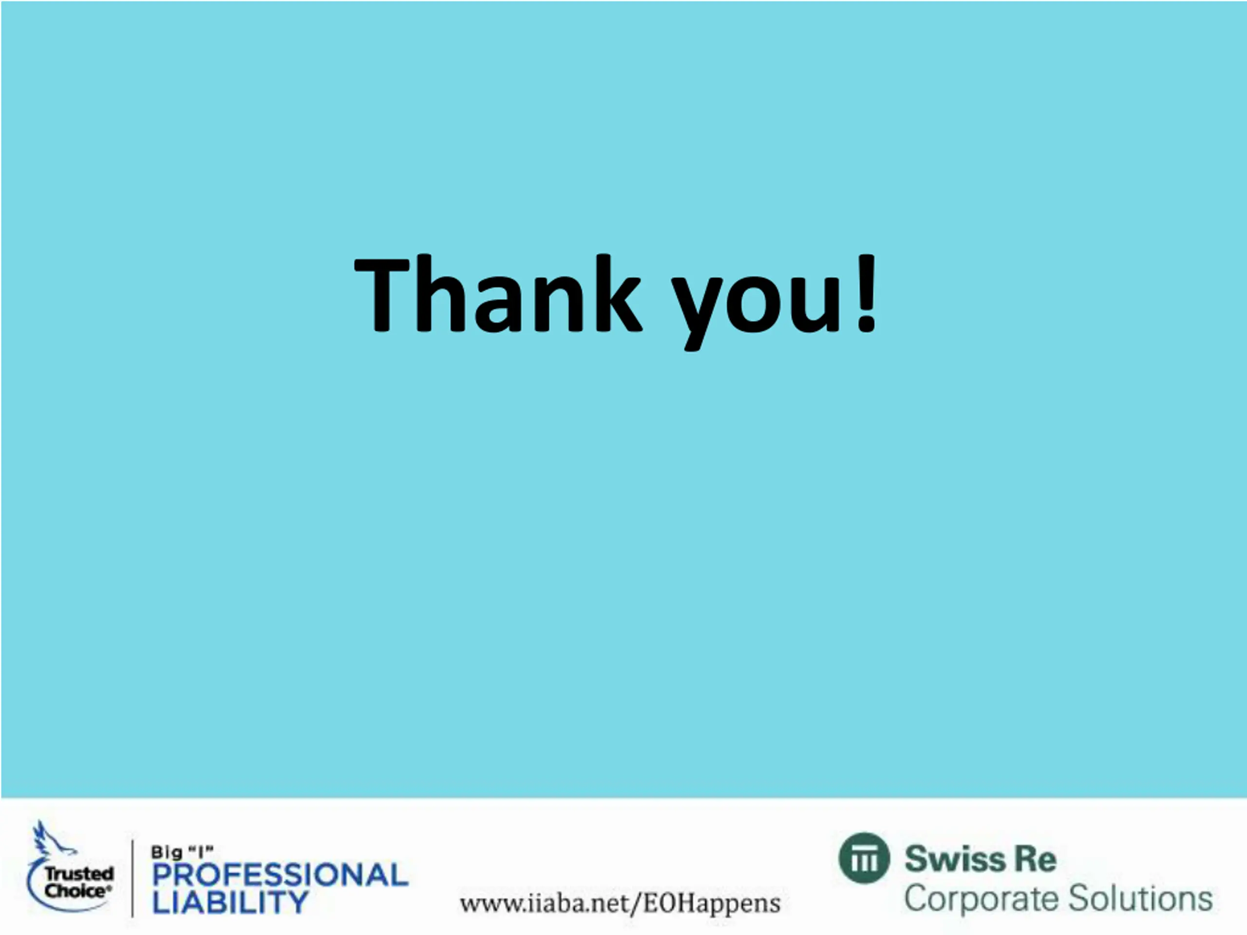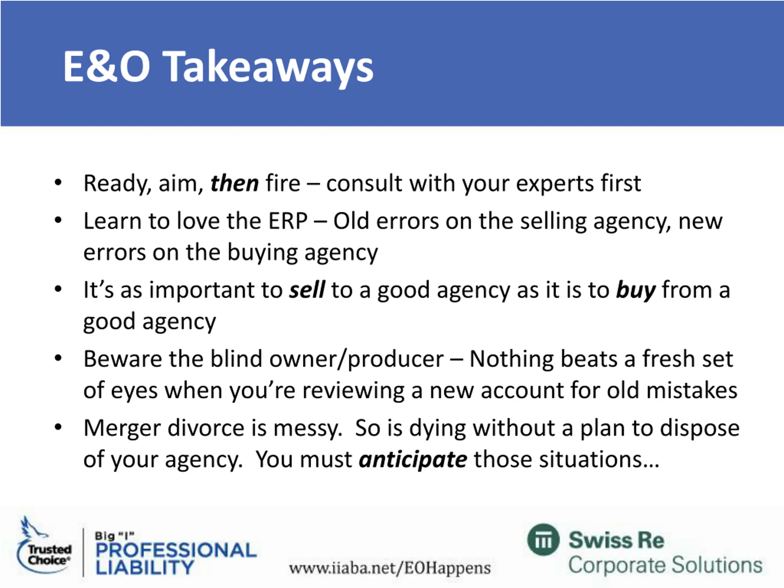 E&O Takeaways Ready, aim, then fire consult with your experts first Learn to love the ERP Old errors on the selling agency, new errors on the buying agency It s as important to sell to a good agency as it is to buy from a good agency Beware the blind owner/producer Nothing beats a fresh set of eyes when you re reviewing a new account for old mistakes Merger divorce is messy. So is dying without a plan to dispose of your agency. You must anticipatethose situations