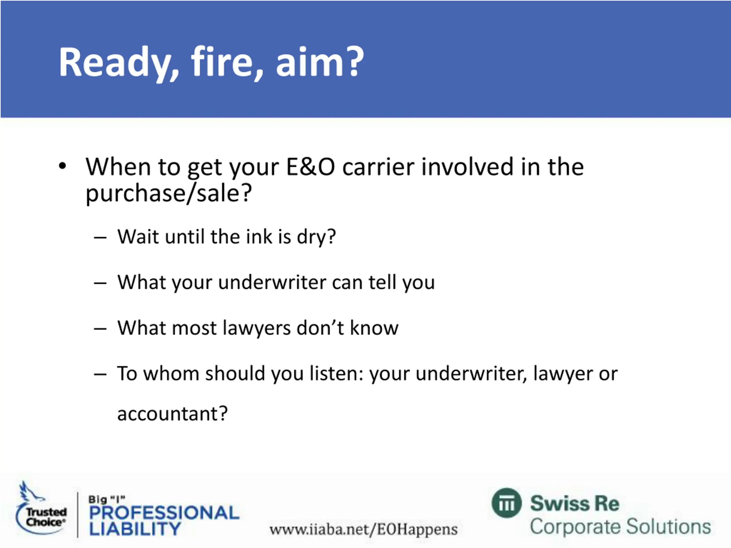 Ready, fire, aim? When to get your E&O carrier involved in the purchase/sale? Wait until the ink is dry? What your underwriter can tell you What most lawyers don t know To whom should you listen: your underwriter, lawyer or accountant?