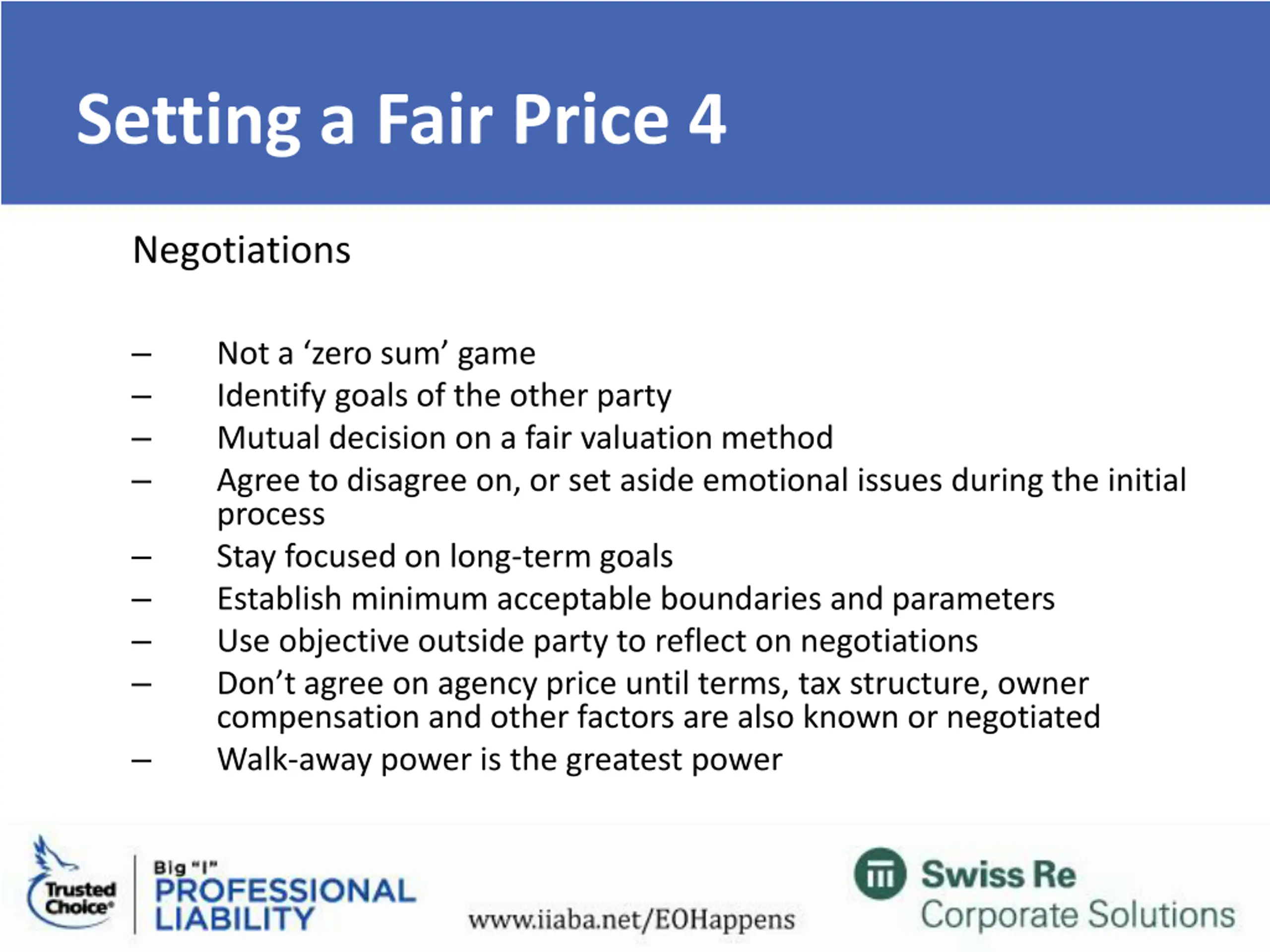 Setting a Fair Price 4 Negotiations Not a zero sum game Identify goals of the other party Mutual decision on a fair valuation method Agree to disagree on, or set aside emotional issues during the initial process Stay focused on long-term goals Establish minimum acceptable boundaries and parameters Use objective outside party to reflect on negotiations Don t agree on agency price until terms, tax structure, owner compensation and other factors are also known or negotiated Walk-away power is the greatest power
