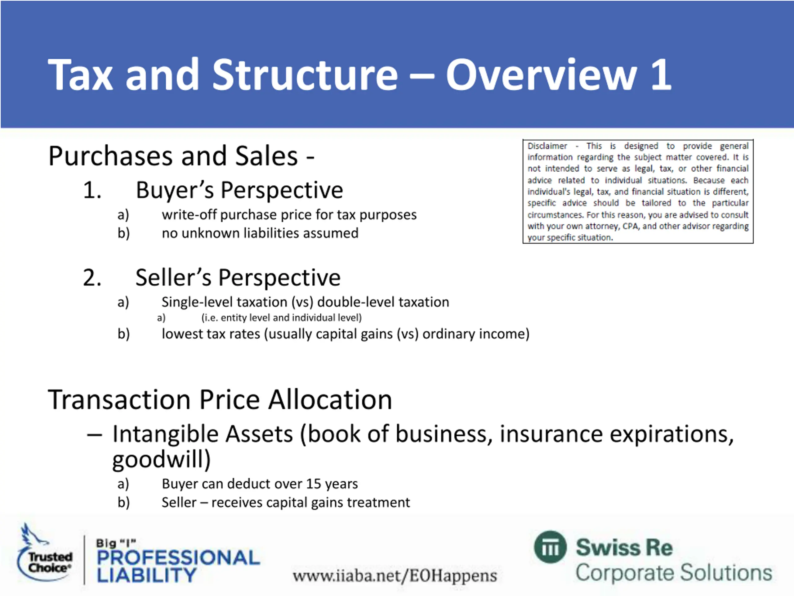 Tax and Structure Overview 1 Purchases and Sales - 1. Buyer s Perspective a) write-off purchase price for tax purposes b) no unknown liabilities assumed 2. Seller s Perspective Single-level taxation (vs) double-level taxation a) (i.e. entity level and individual level) lowest tax rates (usually capital gains (vs) ordinary income) a) b) Transaction Price Allocation Intangible Assets (book of business, insurance expirations, goodwill) a) Buyer can deduct over 15 years b) Seller receives capital gains treatment