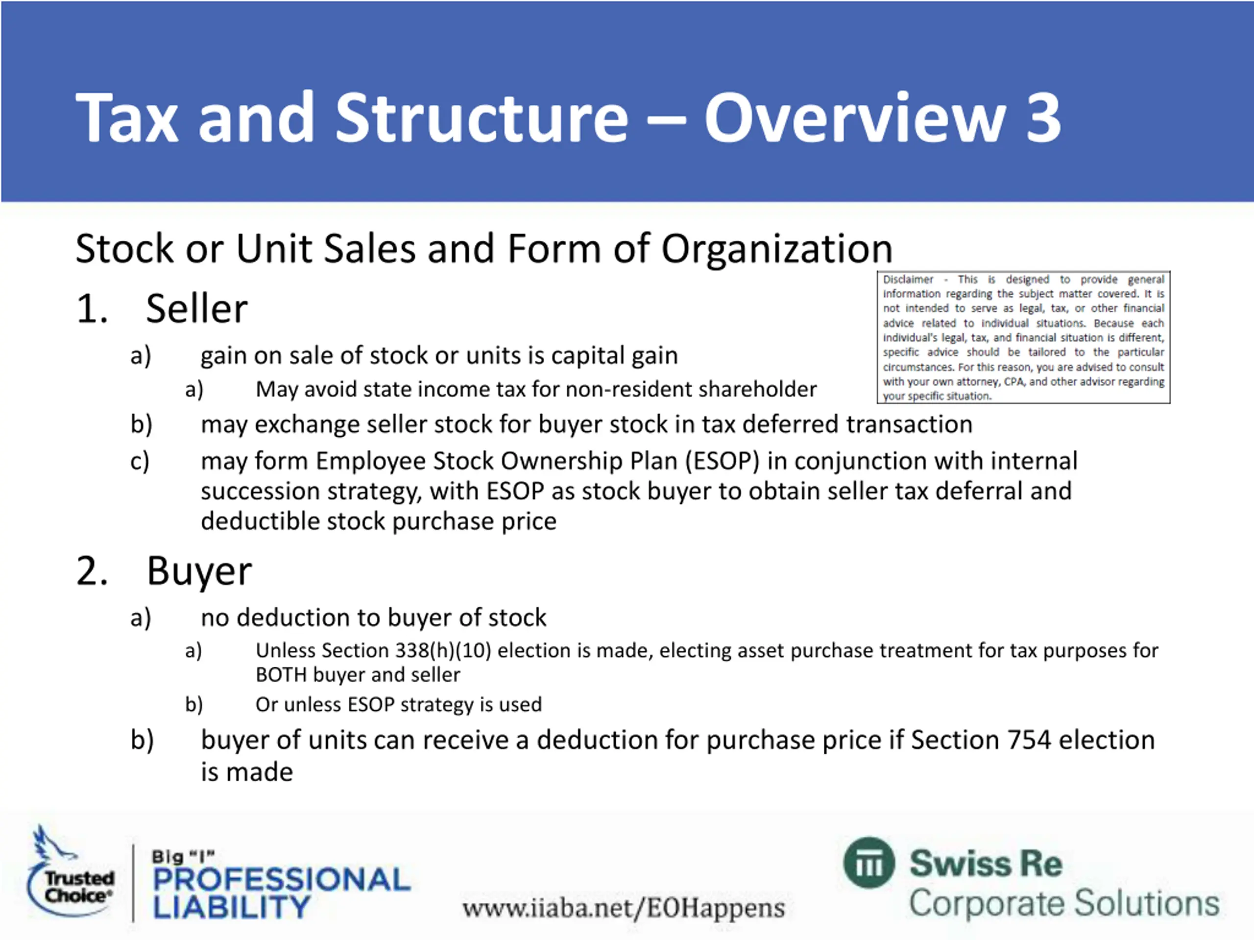 Tax and Structure Overview 3 Stock or Unit Sales and Form of Organization 1. Seller a) gain on sale of stock or units is capital gain a) May avoid state income tax for non-resident shareholder b) may exchange seller stock for buyer stock in tax deferred transaction c) may form Employee Stock Ownership Plan (ESOP) in conjunction with internal succession strategy, with ESOP as stock buyer to obtain seller tax deferral and deductible stock purchase price 2. Buyer a) no deduction to buyer of stock a) Unless Section 338(h)(10) election is made, electing asset purchase treatment for tax purposes for BOTH buyer and seller b) Or unless ESOP strategy is used b) buyer of units can receive a deduction for purchase price if Section 754 election is made