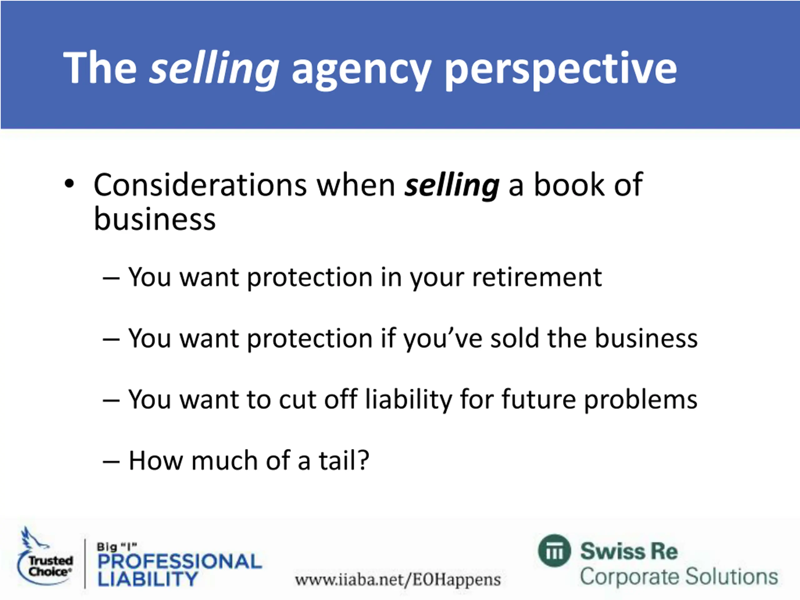 The selling agency perspective Considerations when selling a book of business You want protection in your retirement You want protection if you ve sold the business You want to cut off liability for future problems How much of a tail?