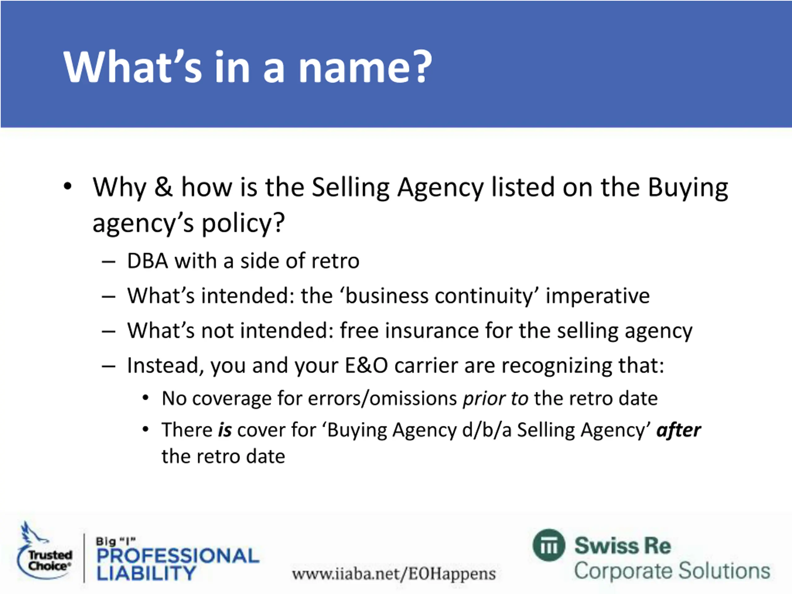Whats in a name? Why & how is the Selling Agency listed on the Buying agency s policy? DBA with a side of retro What s intended: the business continuity imperative What s not intended: free insurance for the selling agency Instead, you and your E&O carrier are recognizing that: No coverage for errors/omissions prior to the retro date There iscover for Buying Agency d/b/a Selling Agency after the retro date