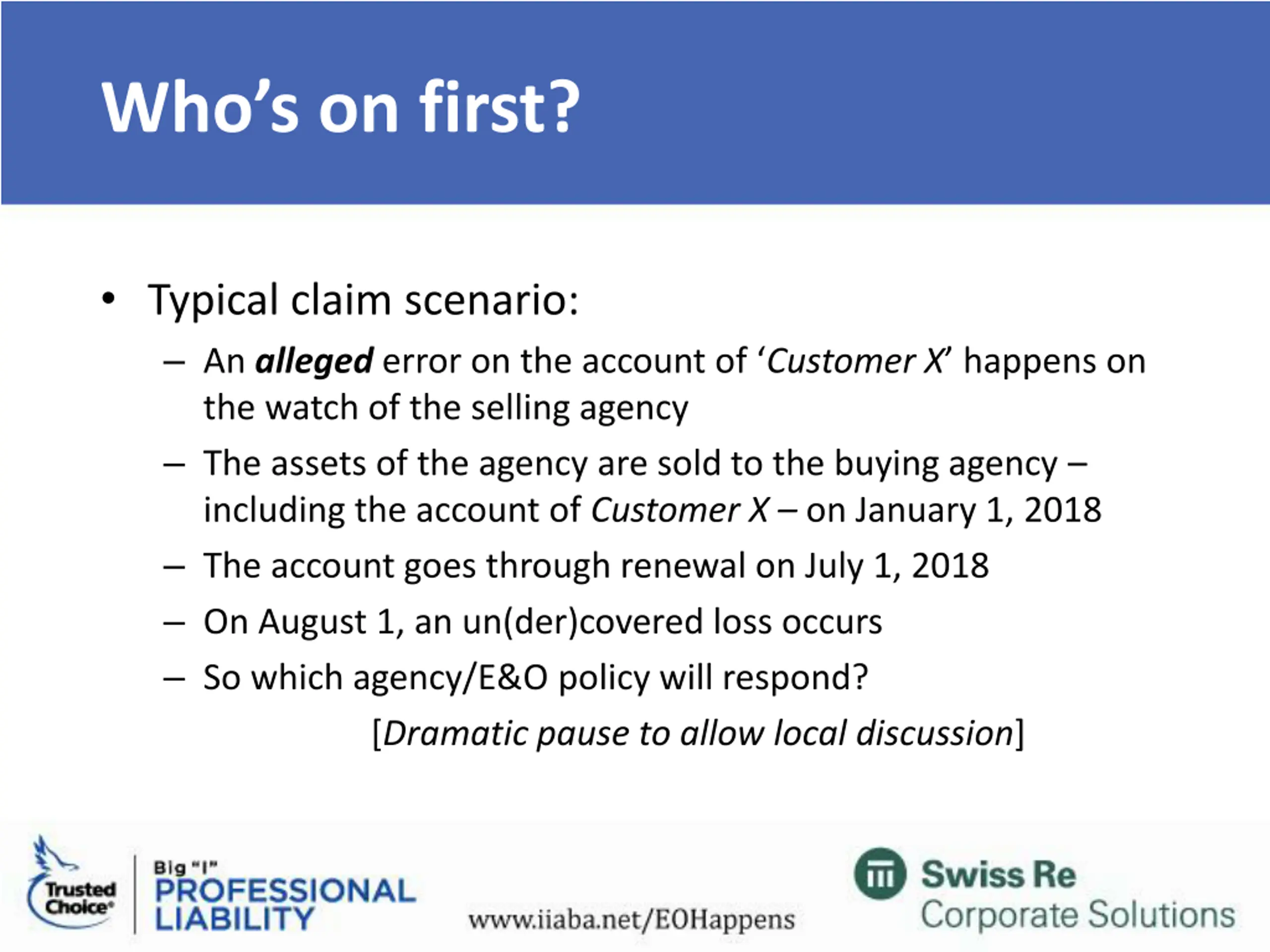 Whos on first? Typical claim scenario: An allegederror on the account of Customer X happens on the watch of the selling agency The assets of the agency are sold to the buying agency including the account of Customer X on January 1, 2018 The account goes through renewal on July 1, 2018 On August 1, an un(der)covered loss occurs So which agency/E&O policy will respond? [Dramatic pause to allow local discussion]