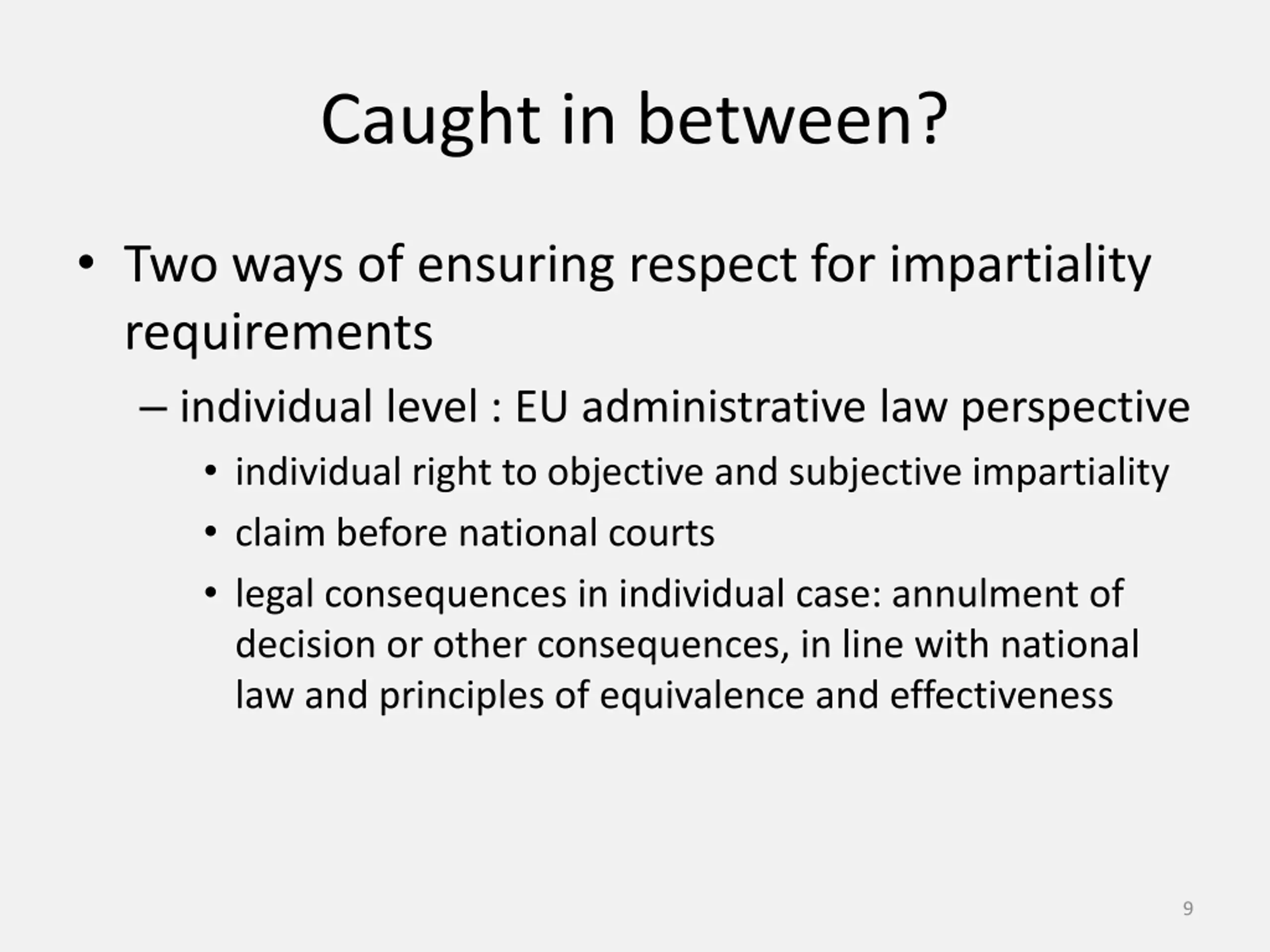Caught in between? Two ways of ensuring respect for impartiality requirements individual level : EU administrative law perspective individual right to objective and subjective impartiality claim before national courts legal consequences in individual case: annulment of decision or other consequences, in line with national law and principles of equivalence and effectiveness 9
