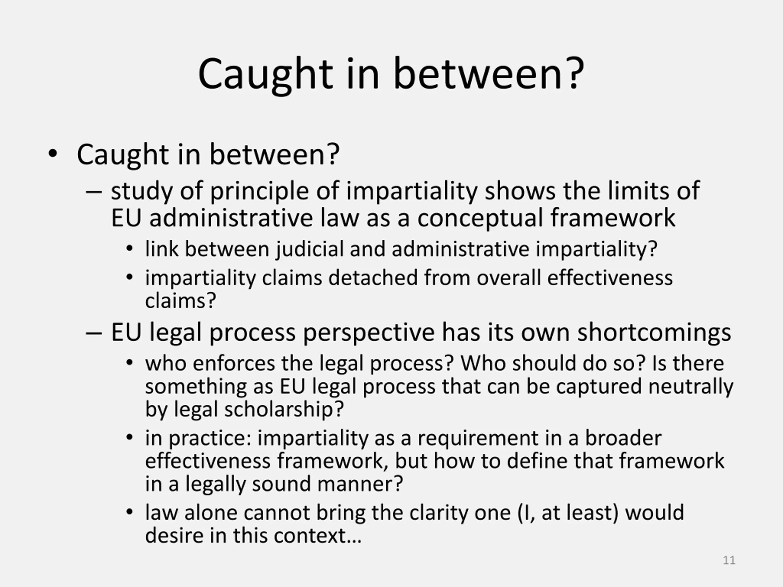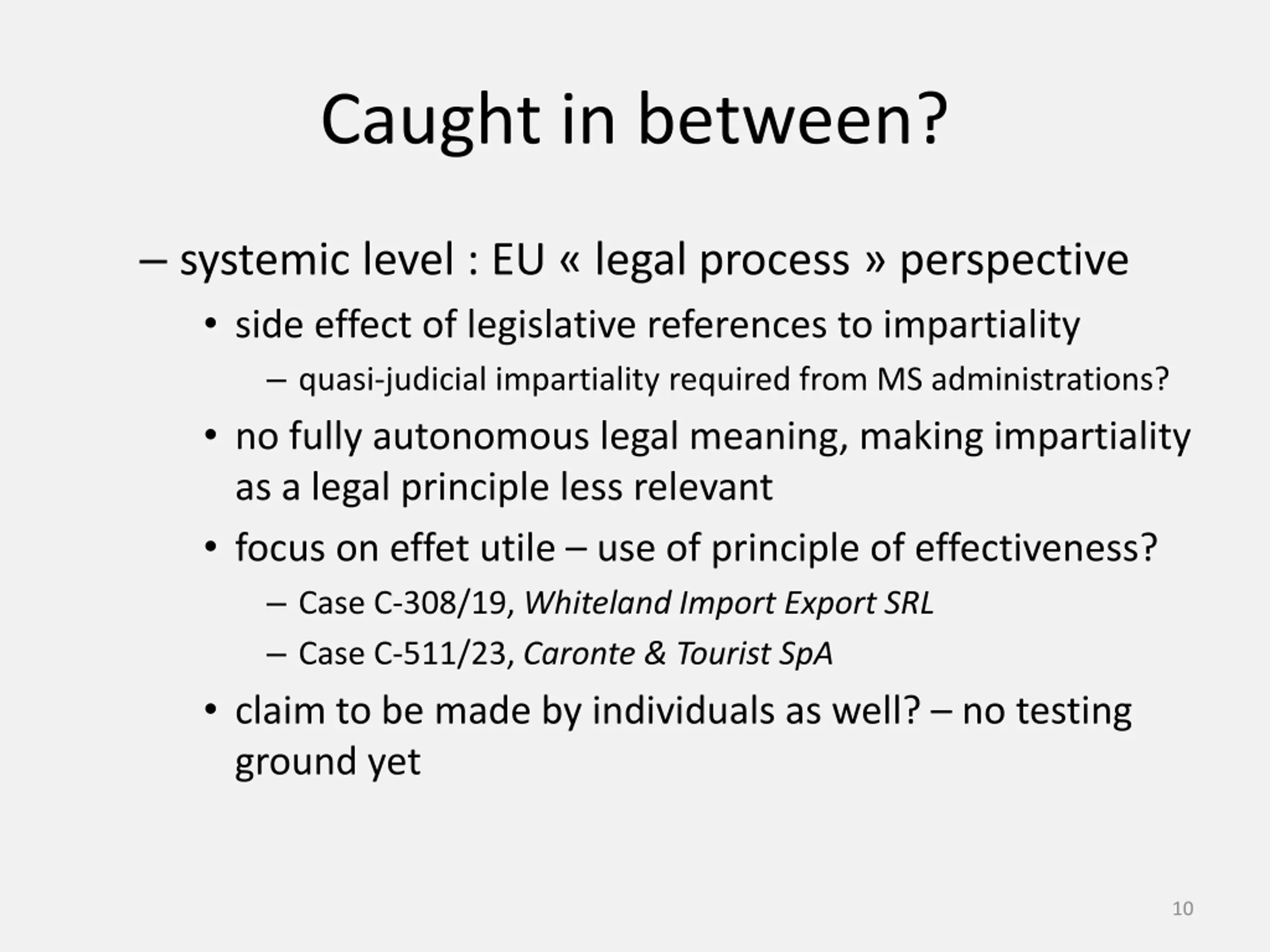 Caught in between? systemic level : EU legal process perspective side effect of legislative references to impartiality quasi-judicial impartiality required from MS administrations? no fully autonomous legal meaning, making impartiality as a legal principle less relevant focus on effet utile use of principle of effectiveness? Case C-308/19, Whiteland Import Export SRL Case C-511/23, Caronte & Tourist SpA claim to be made by individuals as well? no testing ground yet 10