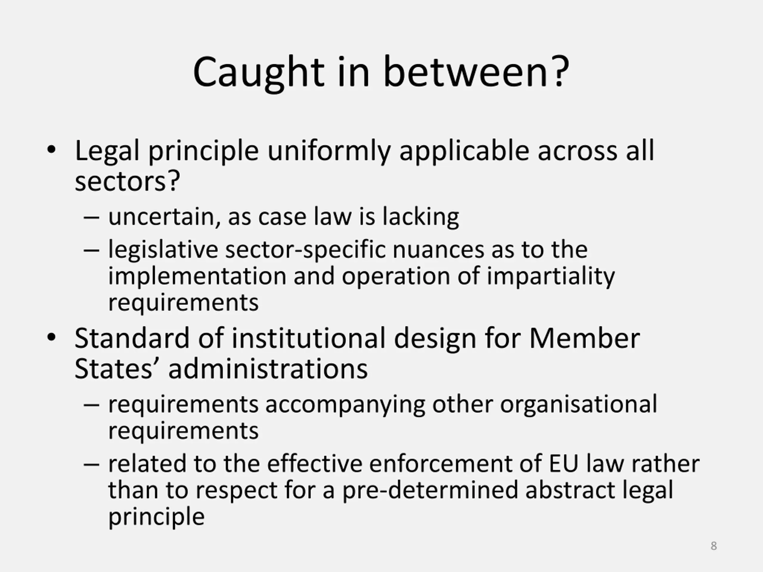 Caught in between? Legal principle uniformly applicable across all sectors? uncertain, as case law is lacking legislative sector-specific nuances as to the implementation and operation of impartiality requirements Standard of institutional design for Member States administrations requirements accompanying other organisational requirements related to the effective enforcement of EU law rather than to respect for a pre-determined abstract legal principle 8