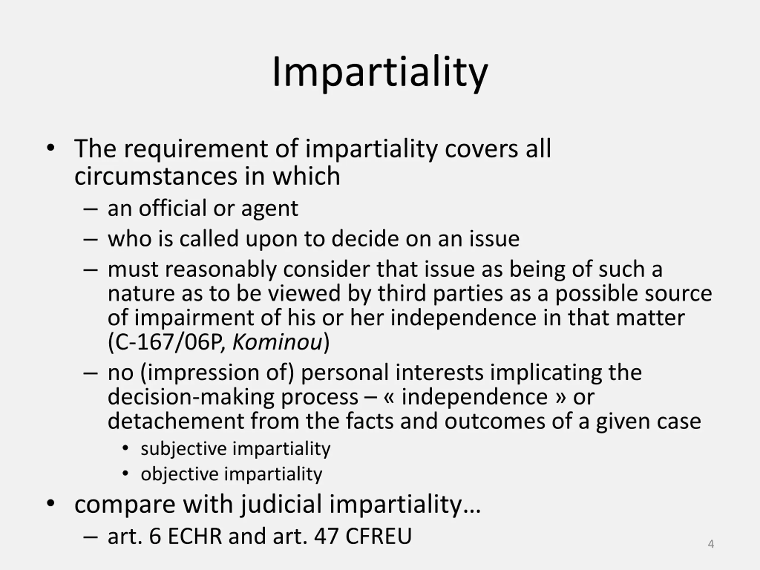 Impartiality principle of good administration art. 41 CFREU: every person is entitled to have his or her affairs handled impartially by an EU institution, office, body or agency general requirement, made specific by right to be heard, right of access to one s file and duty to state reasons objective and subjective impartiality limited case law, including Cases C-512/15, Spain v Council; C-680/16 P, Wolff and Remedia v Commission; C-6/21 P, Germany v Pharma Mar and Commission; C-291/22 P, D & A Pharma v Commission general principle of EU law: extends to Member States administrations when acting within the scope of EU law (Case ) no exceptions <-> nat l laws of (some) Member States objective and subjective impartiality requirements: Case C-269/90, TU M nchen related to duty of care recent CJEU case law only deals with impartiality of the judiciary, see Joined Cases C-554/21, C-622/21 and C-727/21, Hann-Invest; C-53/23, Association of judges and C-369/23, Vivacom Bulgaria 5