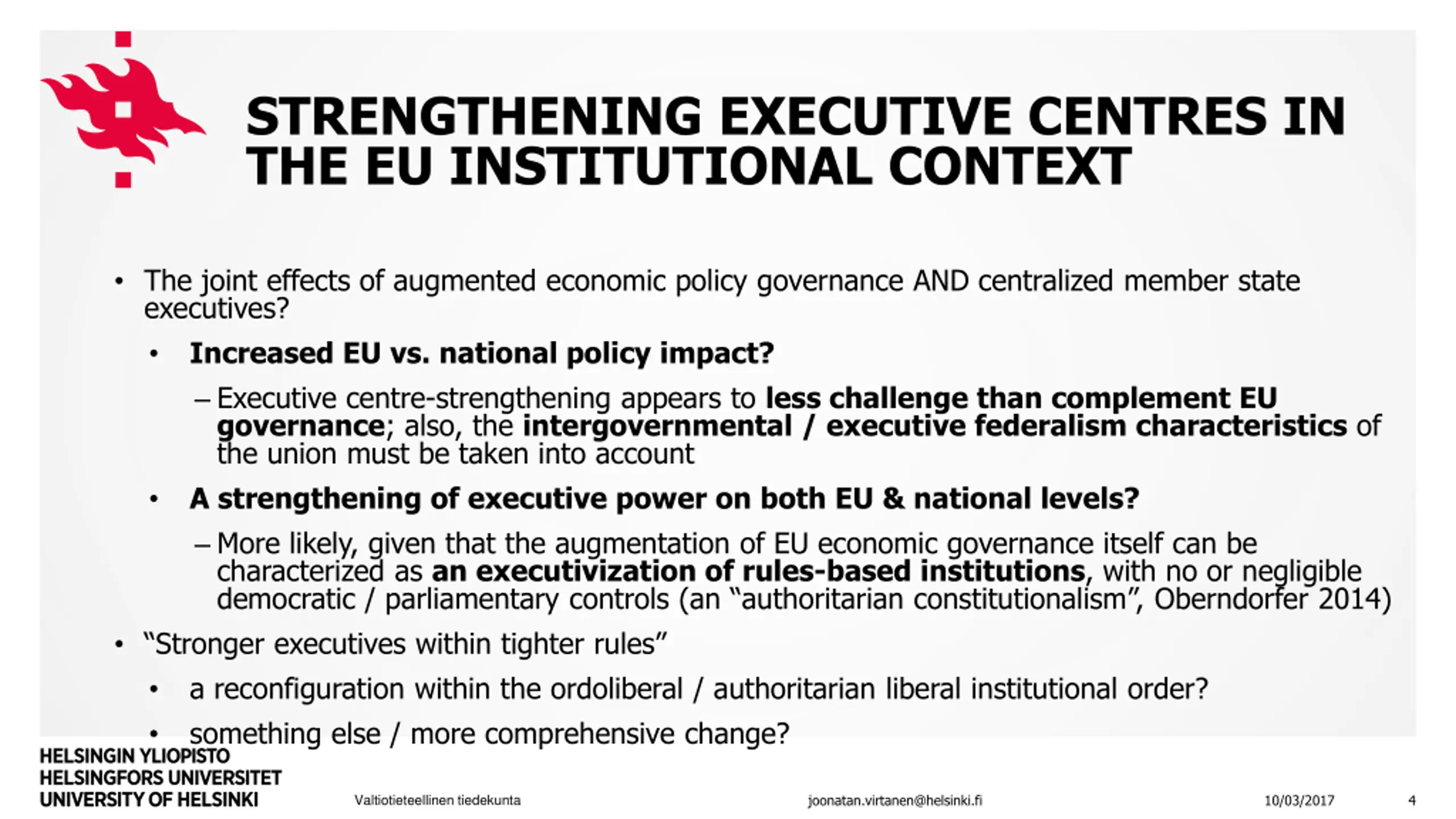 STRENGTHENING EXECUTIVE CENTRES IN THE EU INSTITUTIONAL CONTEXT The joint effects of augmented economic policy governance AND centralized member state executives? Increased EU vs. national policy impact? Executive centre-strengthening appears to less challenge than complement EU governance; also, the intergovernmental / executive federalism characteristics of the union must be taken into account A strengthening of executive power on both EU & national levels? More likely, given that the augmentation of EU economic governance itself can be characterized as an executivization of rules-based institutions, with no or negligible democratic / parliamentary controls (an authoritarian constitutionalism , Oberndorfer 2014) Stronger executives within tighter rules a reconfiguration within the ordoliberal / authoritarian liberal institutional order? something else / more comprehensive change? joonatan.virtanen@helsinki.fi 10/03/2017 4 Valtiotieteellinen tiedekunta