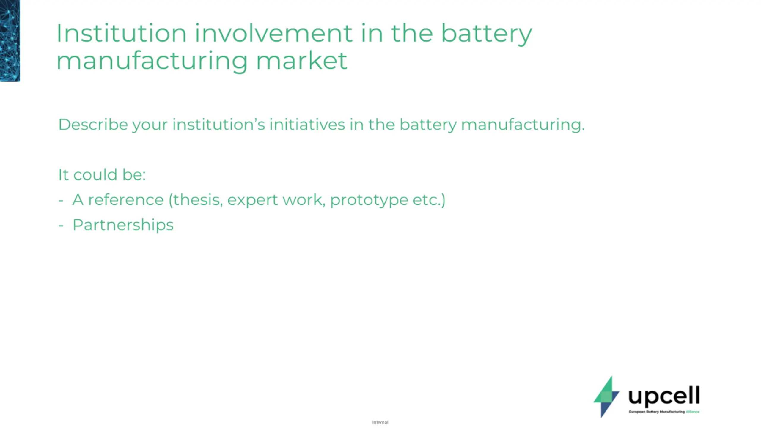 Institution involvement in the battery manufacturing market Describe your institution s initiatives in the battery manufacturing. It could be: - A reference (thesis, expert work, prototype etc.) - Partnerships Internal