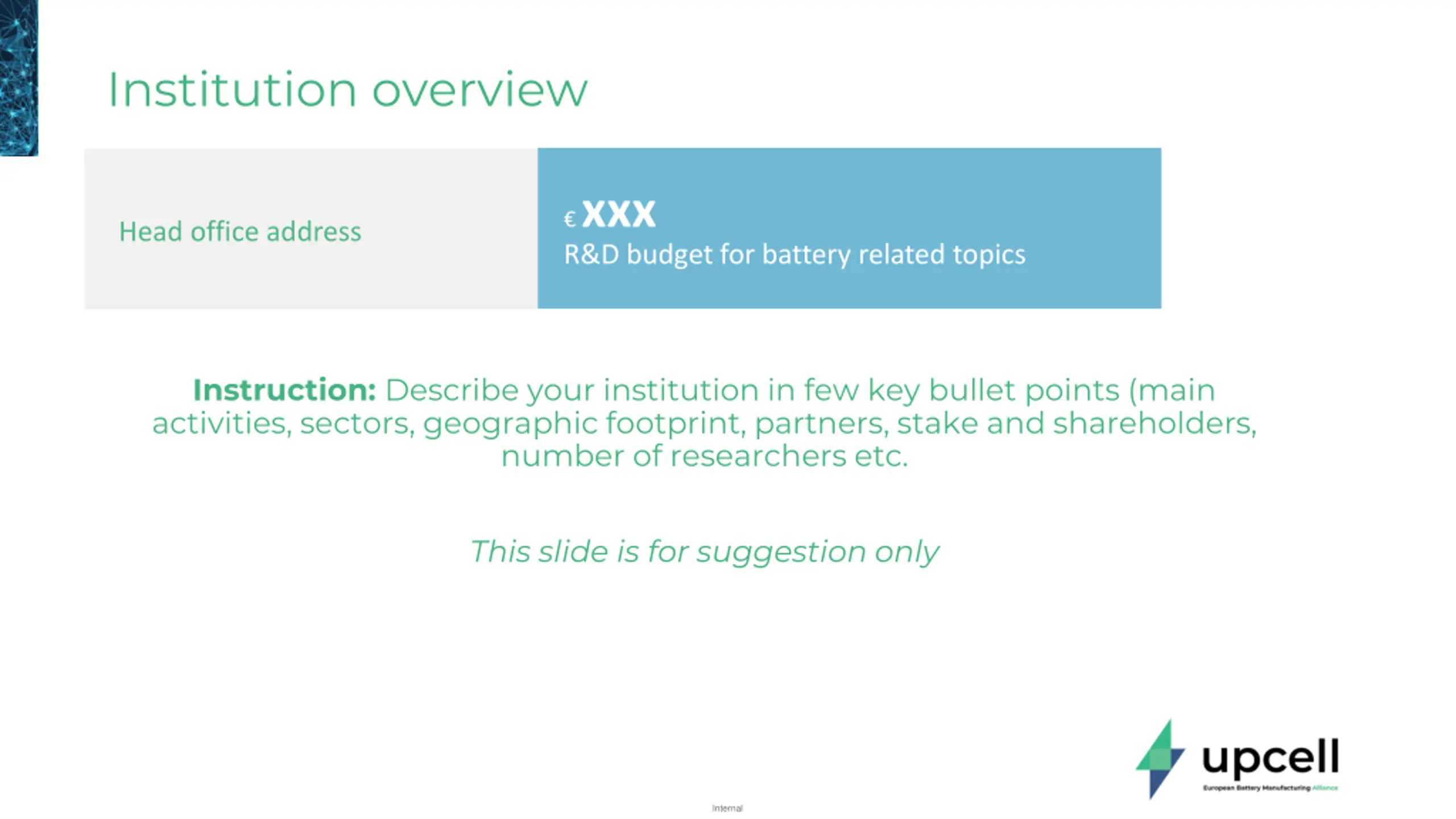 Institution overview xxx R&D budget for battery related topics Head office address Instruction: Describe your institution in few key bullet points (main activities, sectors, geographic footprint, partners, stake and shareholders, number of researchers etc. This slide is for suggestion only Internal