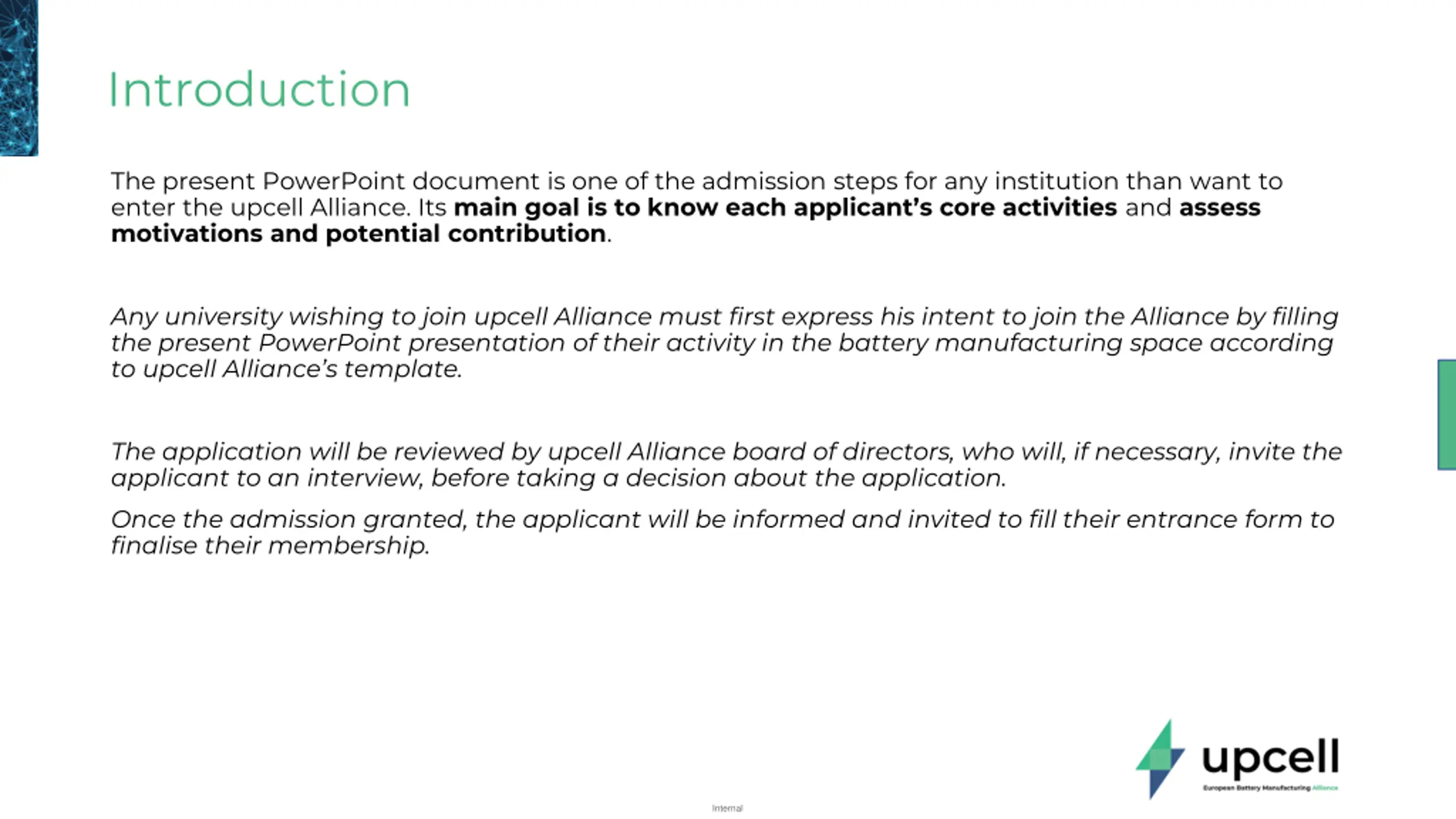 Introduction The present PowerPoint document is one of the admission steps for any institution than want to enter the upcell Alliance. Its main goal is to know each applicant s core activities and assess motivations and potential contribution. Any university wishing to join upcell Alliance must first express his intent to join the Alliance by filling the present PowerPoint presentation of their activity in the battery manufacturing space according to upcell Alliance s template. The application will be reviewed by upcell Alliance board of directors, who will, if necessary, invite the applicant to an interview, before taking a decision about the application. Once the admission granted, the applicant will be informed and invited to fill their entrance form to finalise their membership. Internal