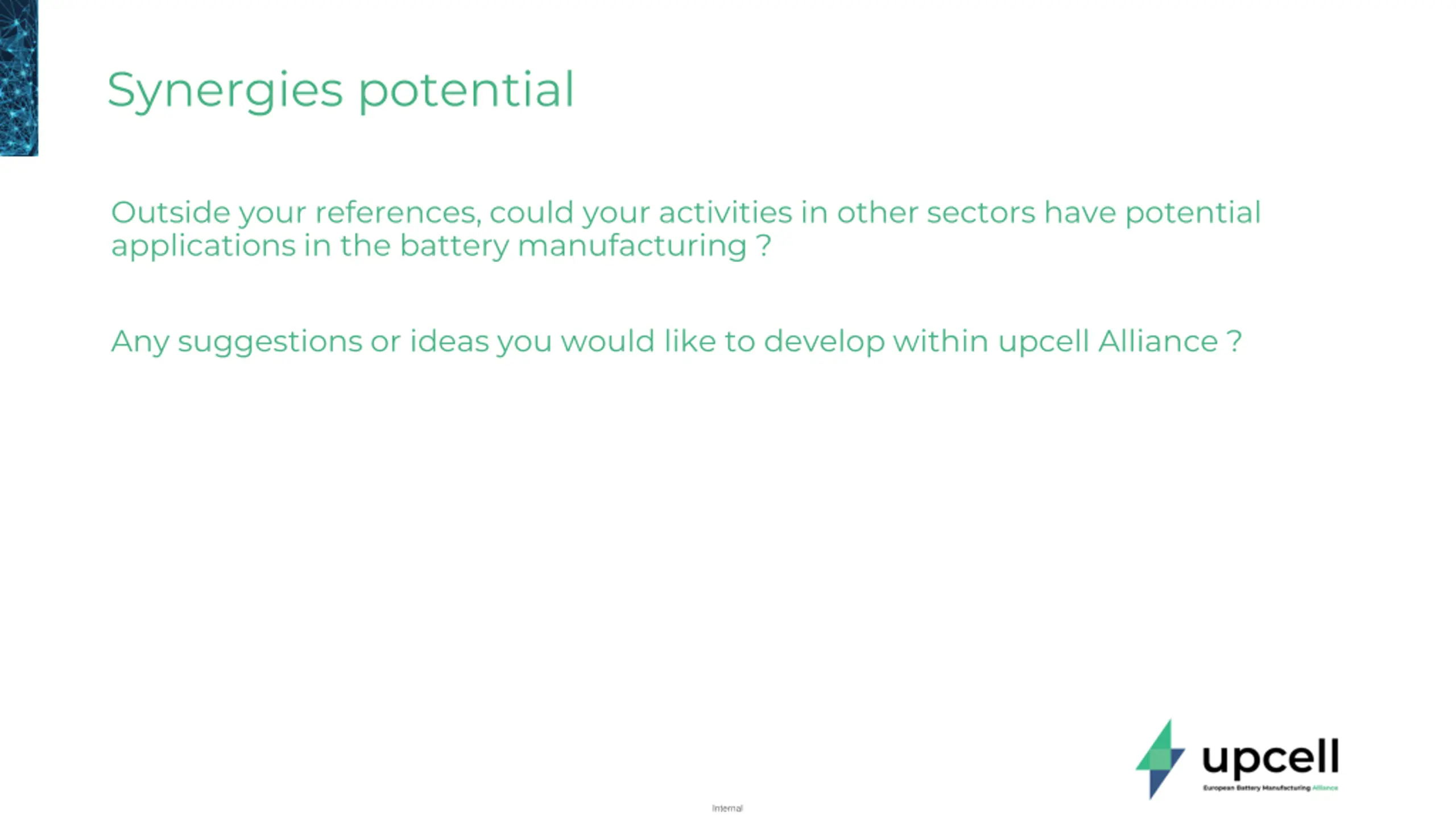 Synergies potential Outside your references, could your activities in other sectors have potential applications in the battery manufacturing ? Any suggestions or ideas you would like to develop within upcell Alliance ? Internal