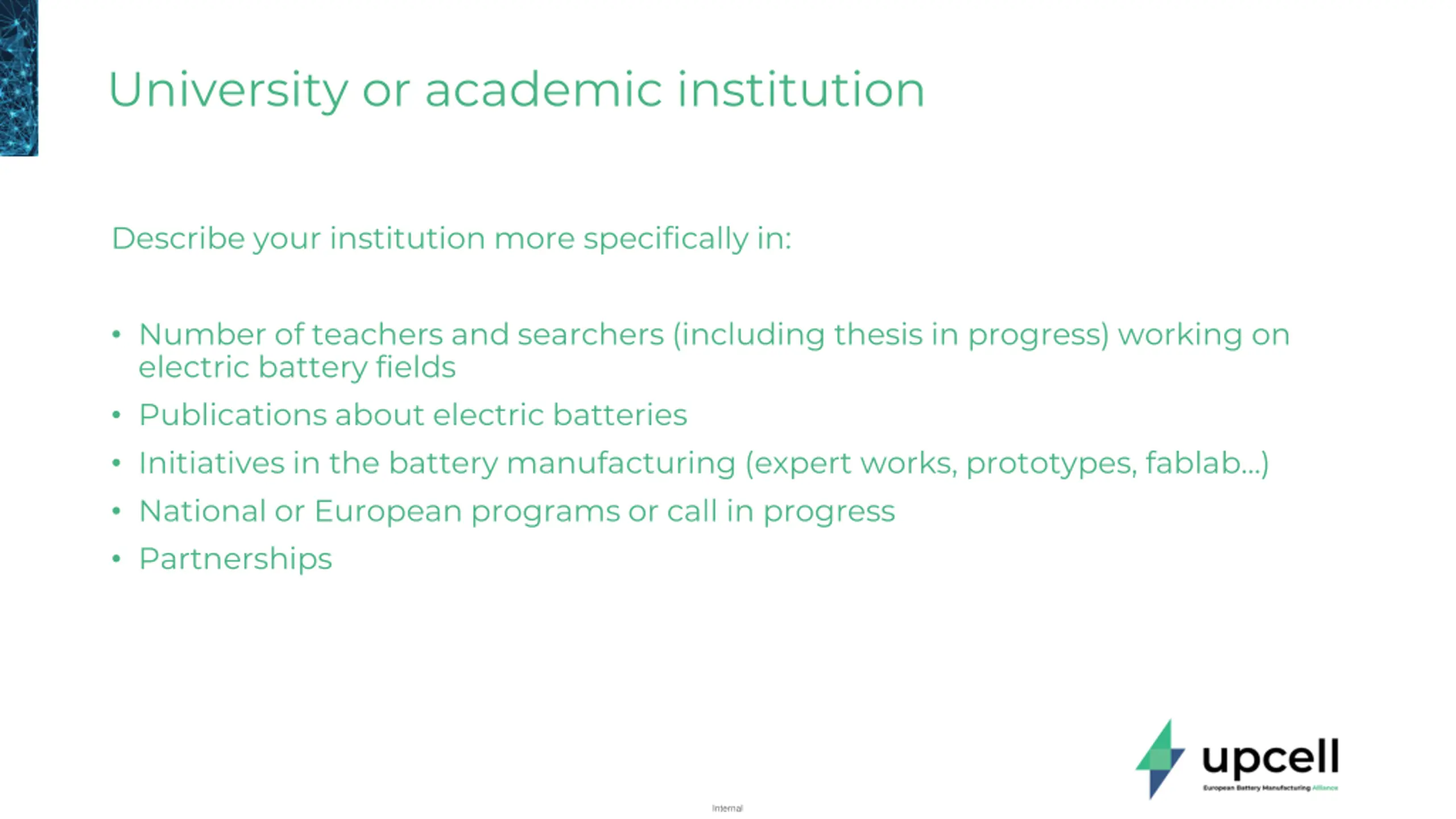University or academic institution Describe your institution more specifically in: Number of teachers and searchers (including thesis in progress) working on electric battery fields Publications about electric batteries Initiatives in the battery manufacturing (expert works, prototypes, fablab ) National or European programs or call in progress Partnerships Internal