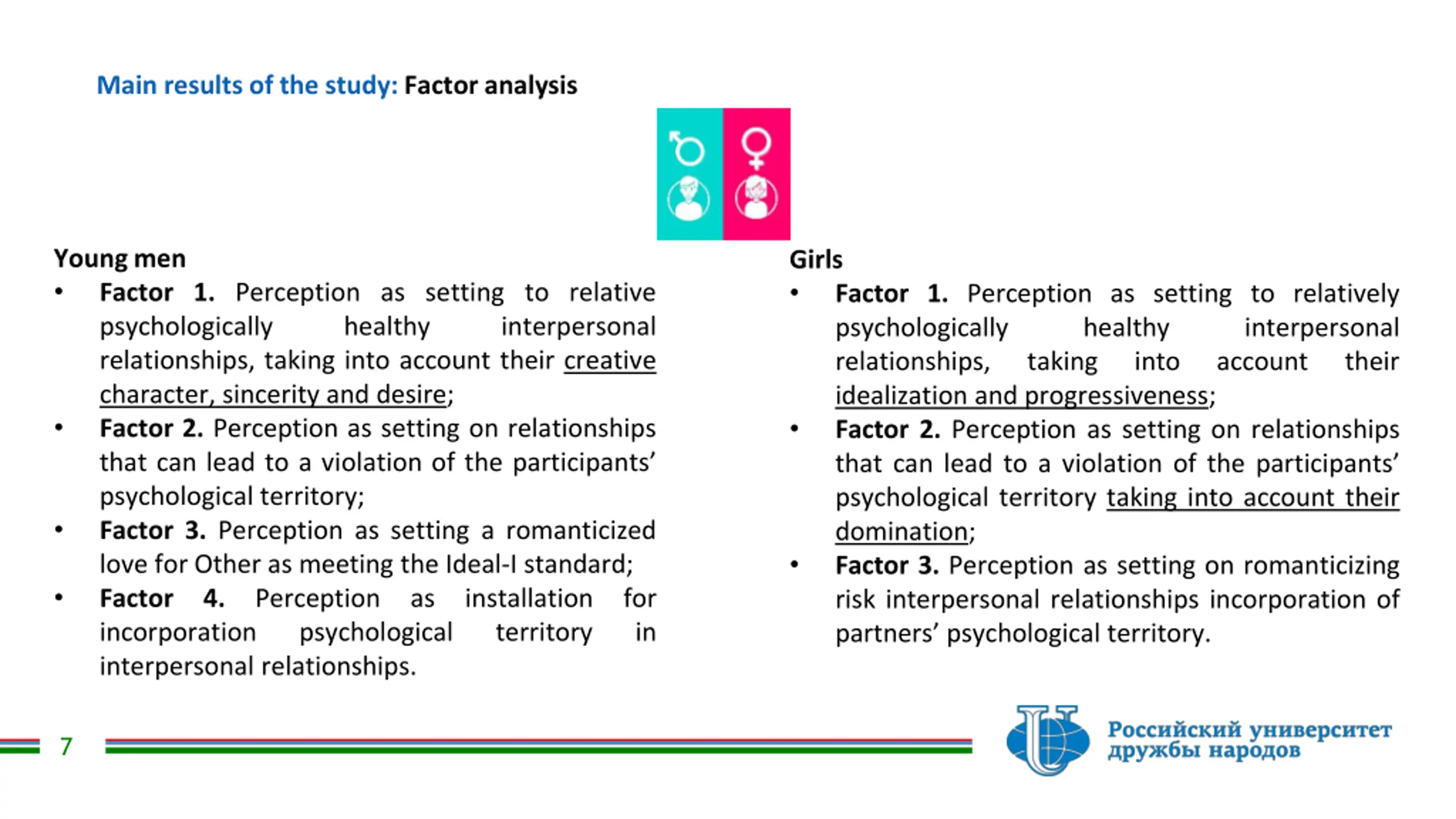 Main results of the study: Factor analysis Young men Factor 1. Perception as setting to relative psychologically healthy relationships, taking into account their creative character, sincerity and desire; Factor 2. Perception as setting on relationships that can lead to a violation of the participants psychological territory; Factor 3. Perception as setting a romanticized love for Other as meeting the Ideal-I standard; Factor 4. Perception incorporation psychological interpersonal relationships. Girls Factor 1. Perception as setting to relatively psychologically healthy relationships, taking idealization and progressiveness; Factor 2. Perception as setting on relationships that can lead to a violation of the participants psychological territory taking into account their domination; Factor 3. Perception as setting on romanticizing risk interpersonal relationships incorporation of partners psychological territory. interpersonal interpersonal account into their as installation territory for in 7