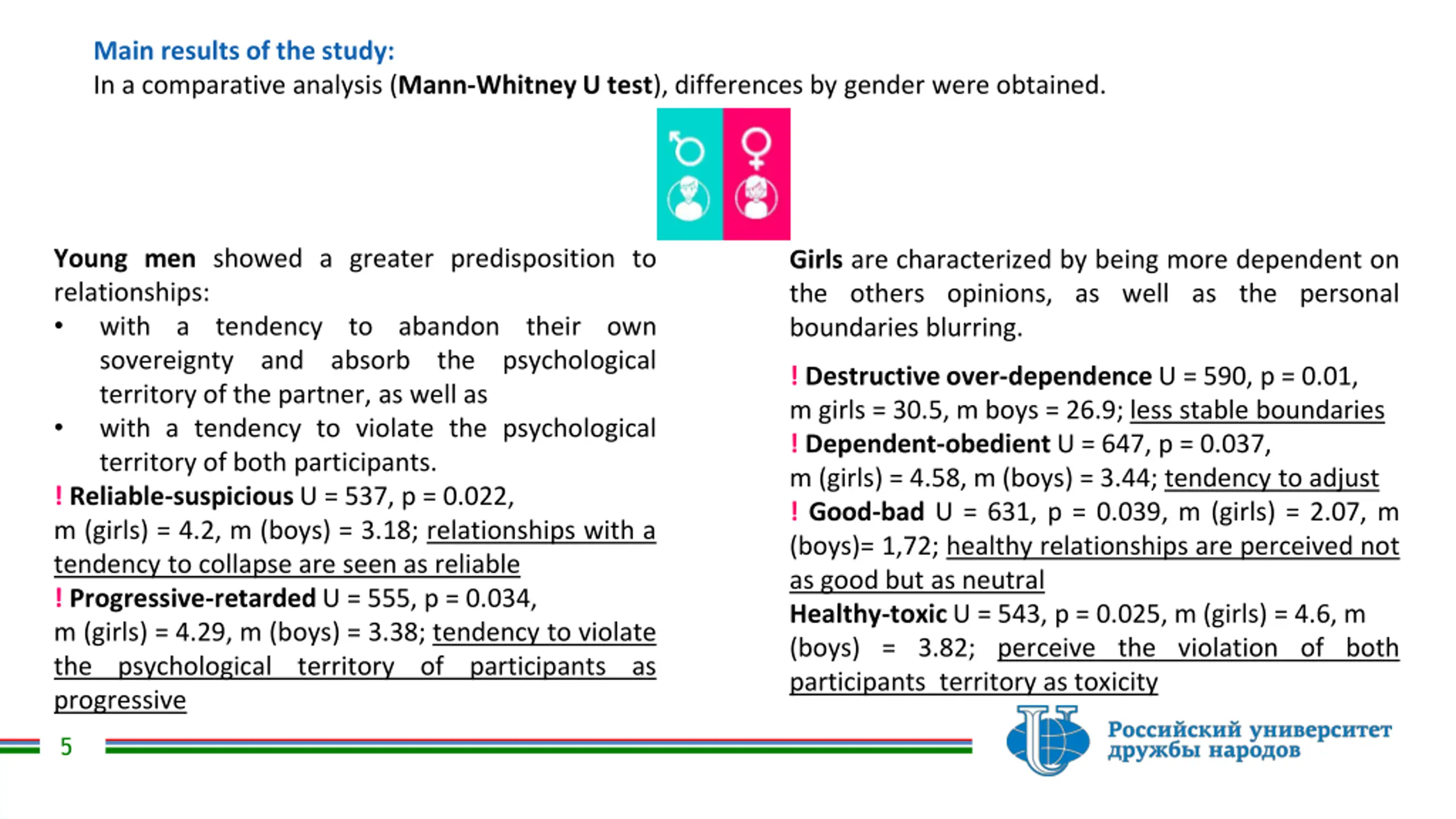 Main results of the study: In a comparative analysis (Mann-Whitney U test), differences by gender were obtained. Young men showed a greater predisposition to relationships: with a tendency to sovereignty and absorb territory of the partner, as well as with a tendency to violate the psychological territory of both participants. ! Reliable-suspiciousU = 537, p = 0.022, m (girls) = 4.2, m (boys) = 3.18; relationships with a tendency to collapse are seen as reliable ! Progressive-retardedU = 555, p = 0.034, m (girls) = 4.29, m (boys) = 3.38; tendency to violate the psychological territory progressive Girls are characterized by being more dependent on the others opinions, as well as the personal boundaries blurring. abandon the their psychological own ! Destructiveover-dependenceU = 590, p = 0.01, m girls = 30.5, m boys = 26.9; less stable boundaries ! Dependent-obedient U = 647, p = 0.037, m (girls) = 4.58, m (boys) = 3.44; tendency to adjust ! Good-bad U = 631, p = 0.039, m (girls) = 2.07, m (boys)= 1,72; healthy relationships are perceived not as good but as neutral Healthy-toxic U = 543, p = 0.025, m (girls) = 4.6, m (boys) = 3.82; perceive the violation of both participants territory as toxicity of participants as 5