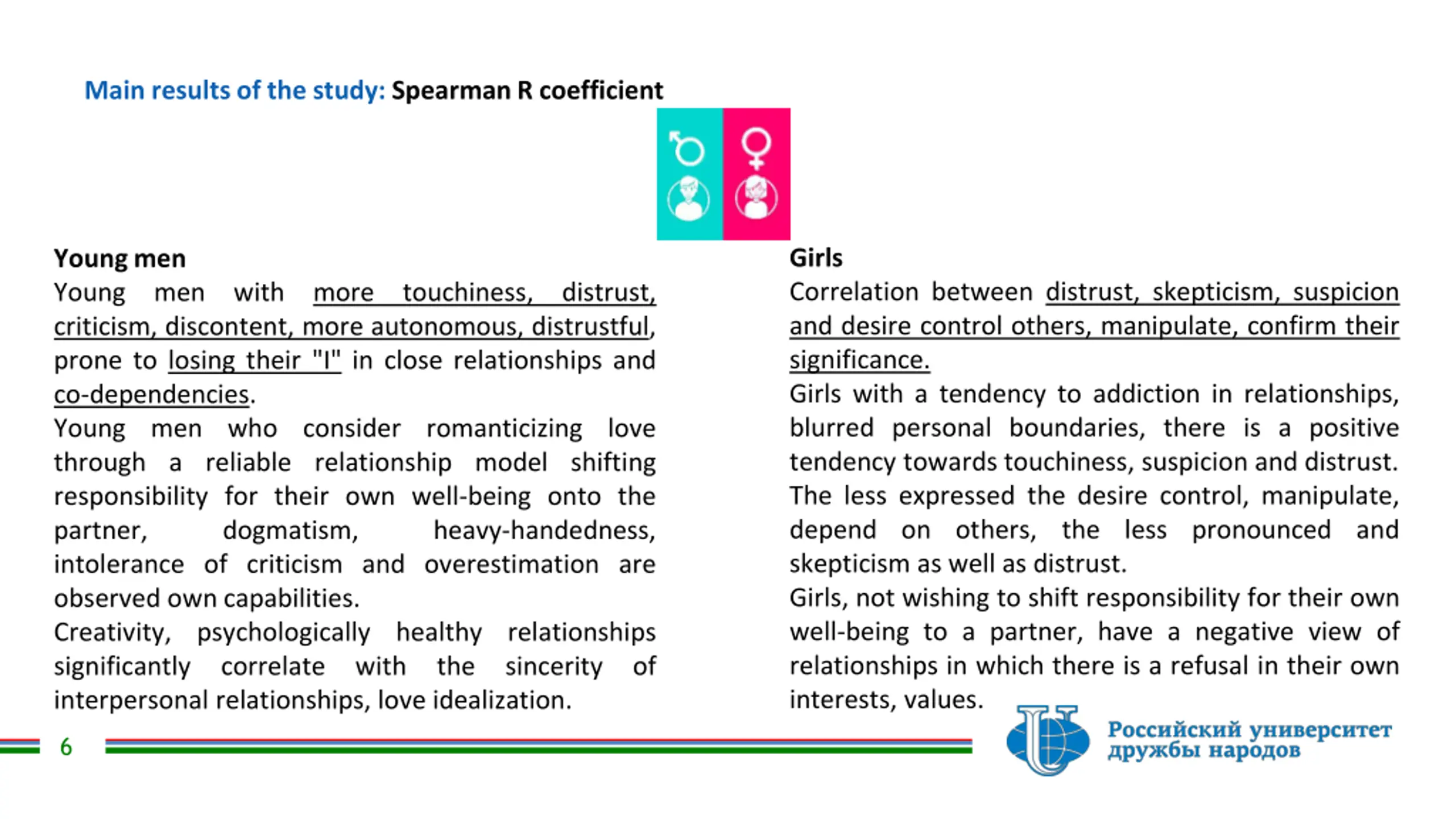Main results of the study: Spearman R coefficient Girls Correlation between distrust, skepticism, suspicion and desire control others, manipulate, confirm their significance. Girls with a tendency to addiction in relationships, blurred personal boundaries, there is a positive tendency towards touchiness, suspicion and distrust. The less expressed the desire control, manipulate, depend on others, the less pronounced and skepticism as well as distrust. Girls, not wishing to shift responsibility for their own well-being to a partner, have a negative view of relationships in which there is a refusal in their own interests, values. Young men Young criticism, discontent, more autonomous, distrustful, prone to losing their "I" in close relationships and co-dependencies. Young men who consider romanticizing love through a reliable relationship model shifting responsibility for their own well-being onto the partner, dogmatism, intolerance of criticism and overestimation are observed own capabilities. Creativity, psychologically healthy relationships significantly correlate interpersonal relationships, love idealization. men with more touchiness, distrust, heavy-handedness, with the sincerity of 6