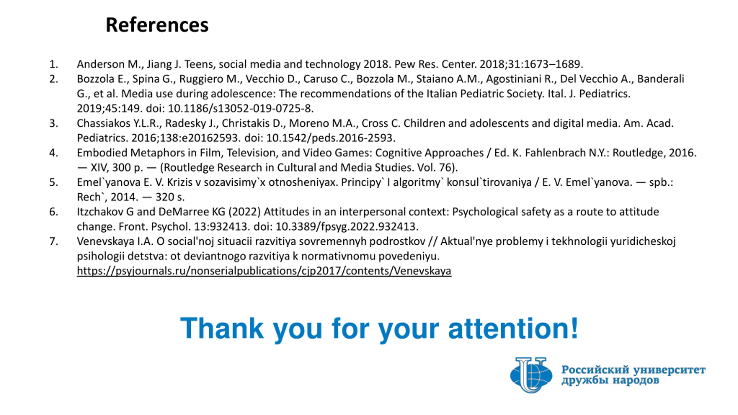References 1. 2. Anderson M., Jiang J. Teens, social media and technology 2018. Pew Res. Center. 2018;31:1673 1689. Bozzola E., Spina G., Ruggiero M., Vecchio D., Caruso C., Bozzola M., Staiano A.M., Agostiniani R., Del Vecchio A., Banderali G., et al. Media use during adolescence: The recommendations of the Italian Pediatric Society. Ital. J. Pediatrics. 2019;45:149. doi: 10.1186/s13052-019-0725-8. Chassiakos Y.L.R., Radesky J., Christakis D., Moreno M.A., Cross C. Children and adolescents and digital media. Am. Acad. Pediatrics. 2016;138:e20162593. doi: 10.1542/peds.2016-2593. Embodied Metaphors in Film, Television, and Video Games: Cognitive Approaches / Ed. K. Fahlenbrach N.Y.: Routledge, 2016. XIV, 300 p. (Routledge Research in Cultural and Media Studies. Vol. 76). Emel`yanova E. V. Krizis v sozavisimy`x otnosheniyax. Principy` I algoritmy` konsul`tirovaniya / E. V. Emel`yanova. spb.: Rech`, 2014. 320 s. Itzchakov G and DeMarree KG (2022) Attitudes in an interpersonal context: Psychological safety as a route to attitude change. Front. Psychol. 13:932413. doi: 10.3389/fpsyg.2022.932413. Venevskaya I.A. O social'noj situacii razvitiya sovremennyhpodrostkov // Aktual'nye problemy i tekhnologii yuridicheskoj psihologii detstva: ot deviantnogo razvitiya k normativnomupovedeniyu. https://psyjournals.ru/nonserialpublications/cjp2017/contents/Venevskaya 3. 4. 5. 6. 7. Thank you for your attention!