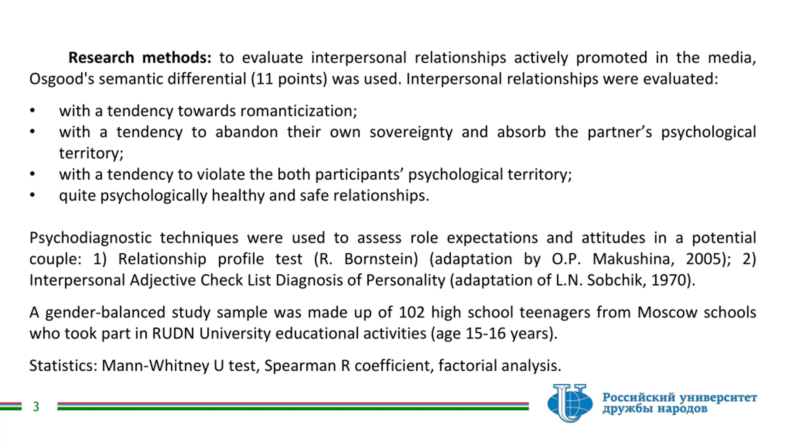 Research methods: to evaluate interpersonal relationships actively promoted in the media, Osgood's semantic differential (11 points) was used. Interpersonal relationships were evaluated: with a tendency towards romanticization; with a tendency to abandon their own sovereignty and absorb the partner s psychological territory; with a tendency to violate the both participants psychological territory; quite psychologically healthy and safe relationships. Psychodiagnostic techniques were used to assess role expectations and attitudes in a potential couple: 1) Relationship profile test (R. Bornstein) (adaptation by O.P. Makushina, 2005); 2) Interpersonal Adjective Check List Diagnosis of Personality (adaptation of L.N. Sobchik, 1970). A gender-balanced study sample was made up of 102 high school teenagers from Moscow schools who took part in RUDN University educational activities (age 15-16 years). Statistics: Mann-Whitney U test, Spearman R coefficient, factorial analysis. 3