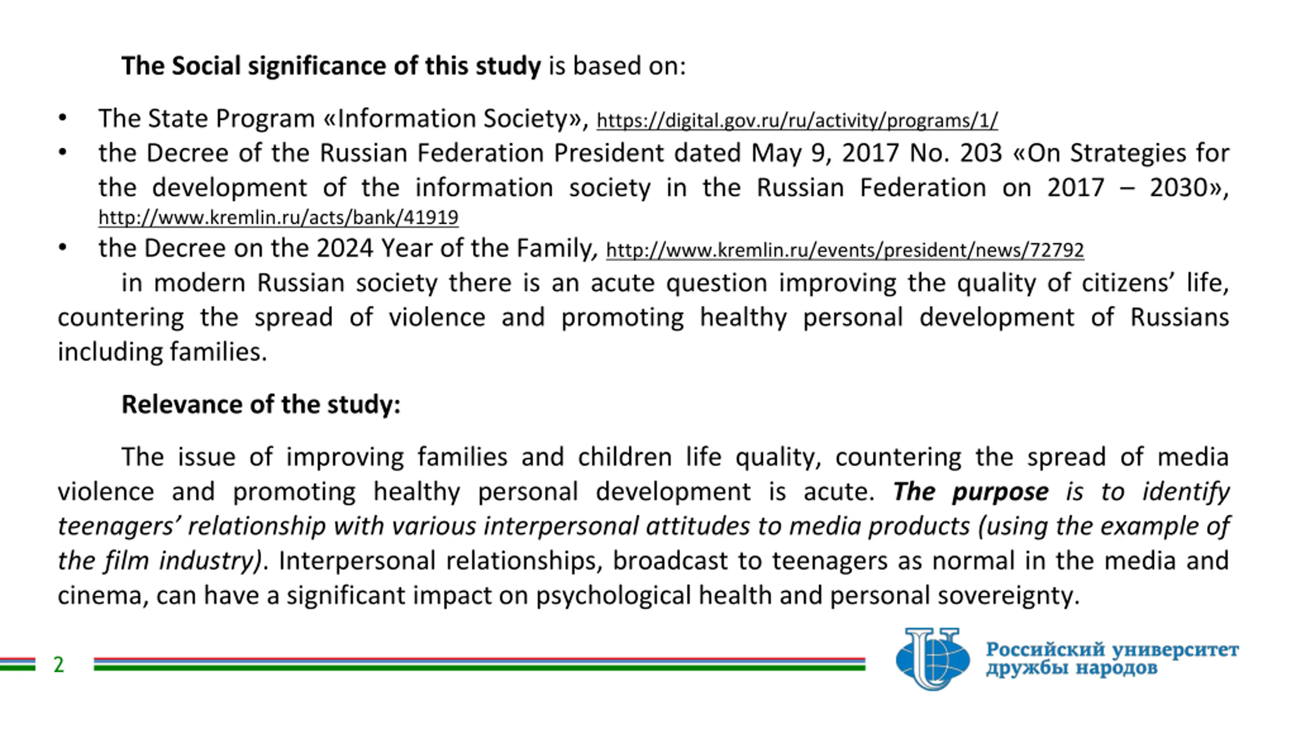 The Social significance of this study is based on: The State Program Information Society , https://digital.gov.ru/ru/activity/programs/1/ the Decree of the Russian Federation President dated May 9, 2017 No. 203 On Strategies for the development of the information society in the Russian Federation on 2017 2030 , http://www.kremlin.ru/acts/bank/41919 the Decree on the 2024 Year of the Family, http://www.kremlin.ru/events/president/news/72792 in modern Russian society there is an acute question improving the quality of citizens life, countering the spread of violence and promoting healthy personal development of Russians including families. Relevance of the study: The issue of improving families and children life quality, countering the spread of media violence and promoting healthy personal development is acute. The purpose is to identify teenagers relationship with various interpersonal attitudes to media products (using the example of the film industry). Interpersonal relationships, broadcast to teenagers as normal in the media and cinema, can have a significant impact on psychological health and personal sovereignty. 2
